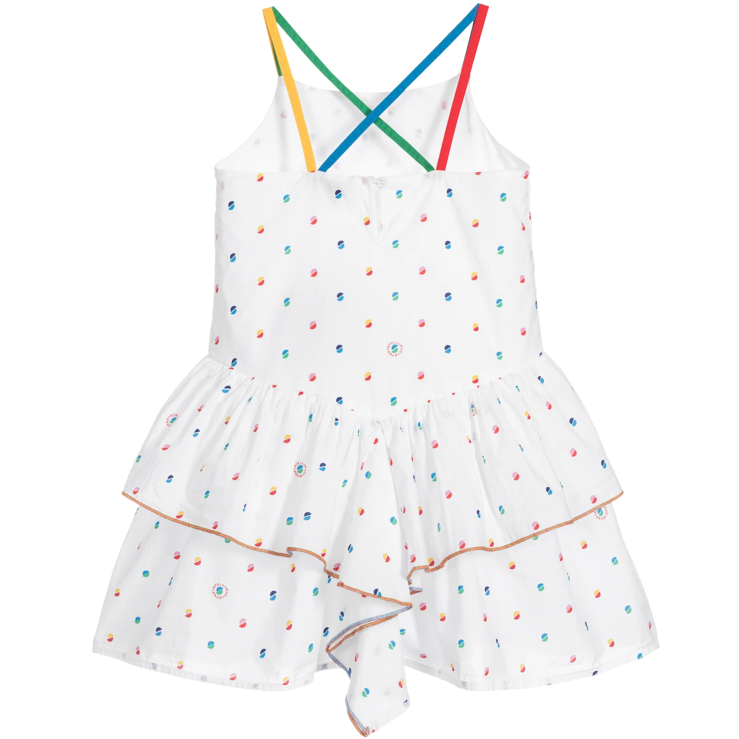 Girls white organic cotton sundress by Stella McCartney Kids, with a pretty graphic pattern in primary colours and logo print. It has yellow, green, red and blue double shoulder straps, a drop waist with ruffled skirt. There is a single button fastening on the back.Â