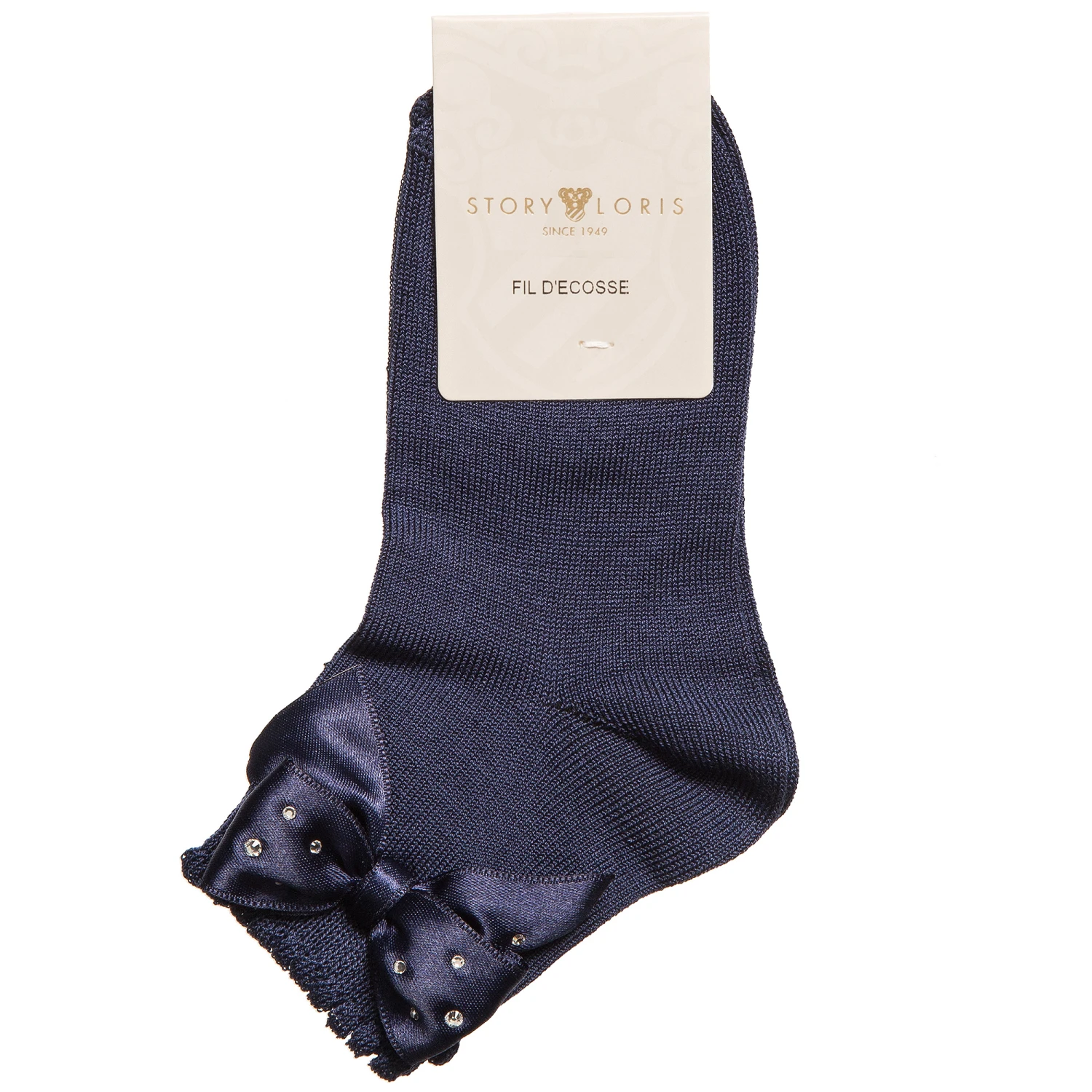 Girls navy blue socks by Story Loris. Finely knitted in a cotton blend, they are decorated with a satin bow embellished with diamanté and have a softly scalloped ankle cuff.