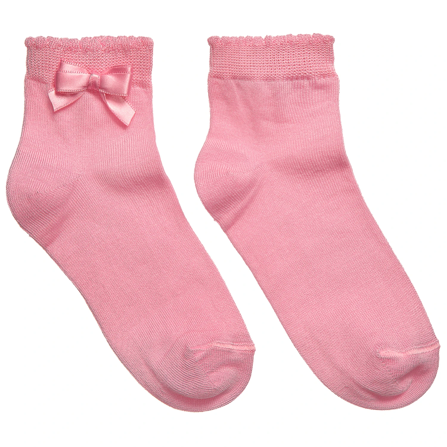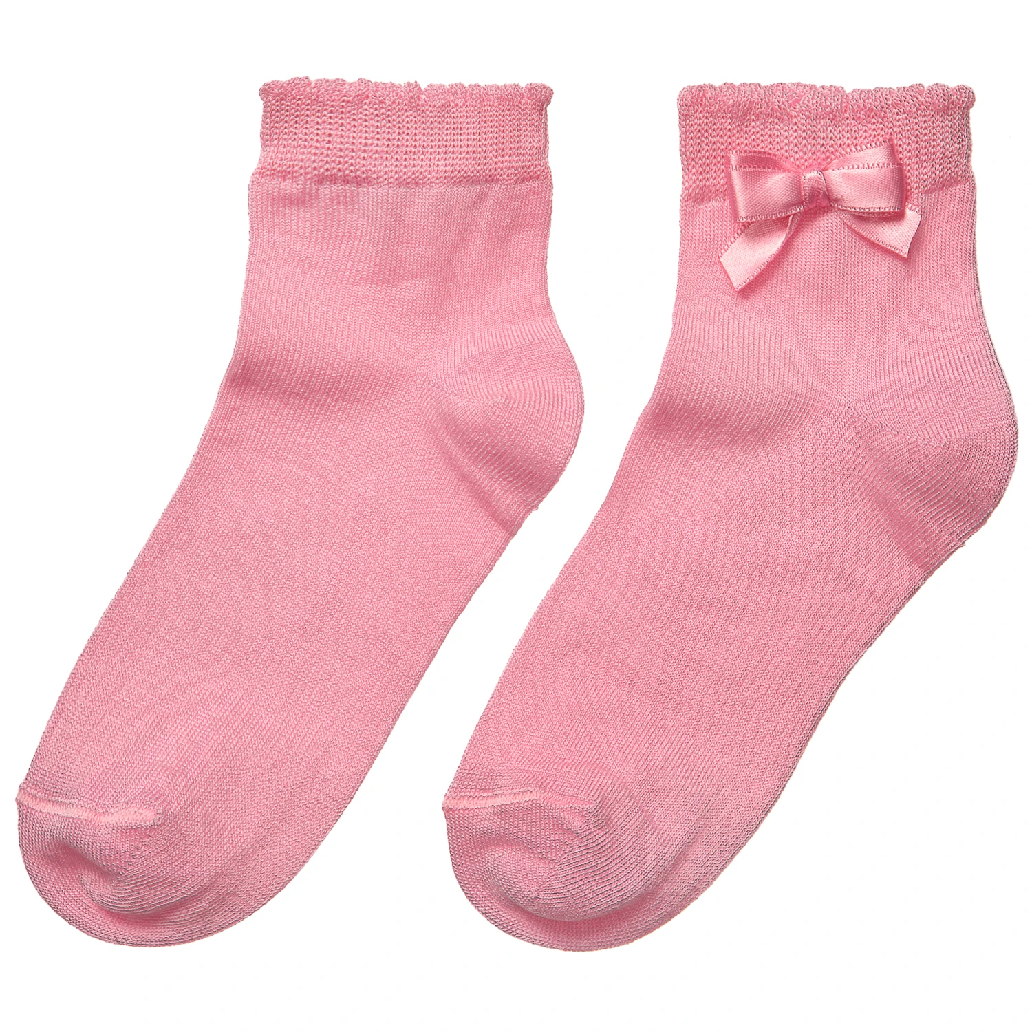 Girls pink socks by Story Loris. Finely knitted in a cotton blend, these socks are decorated with a satin bow and have a softly scalloped ankle cuff.