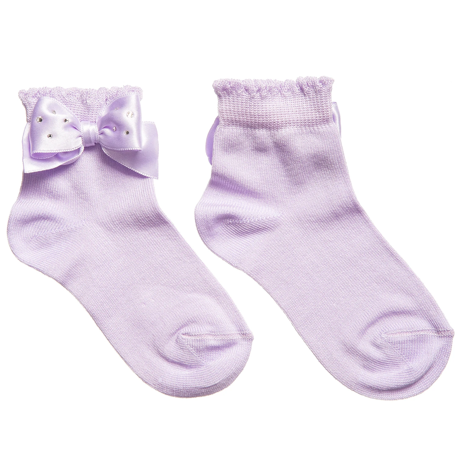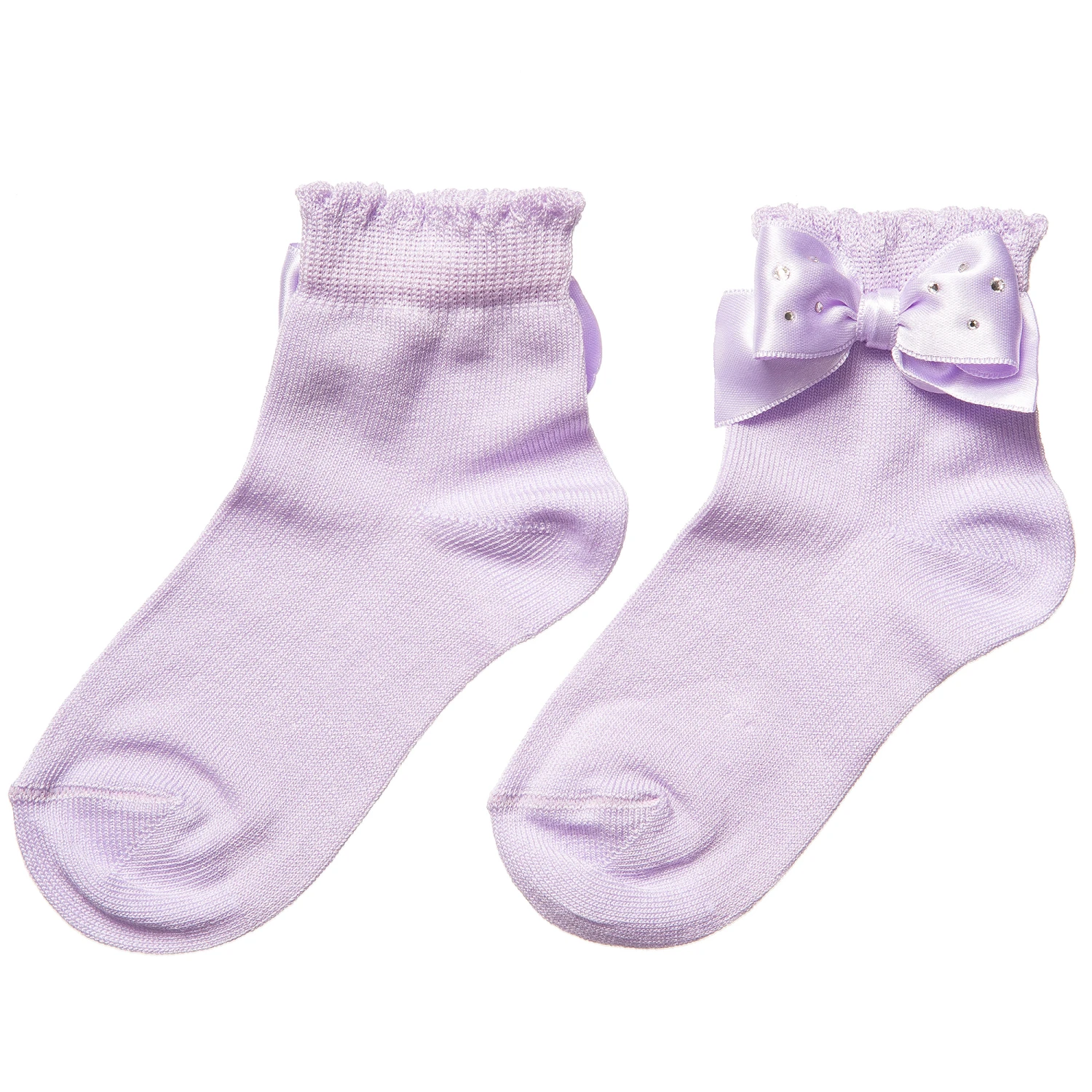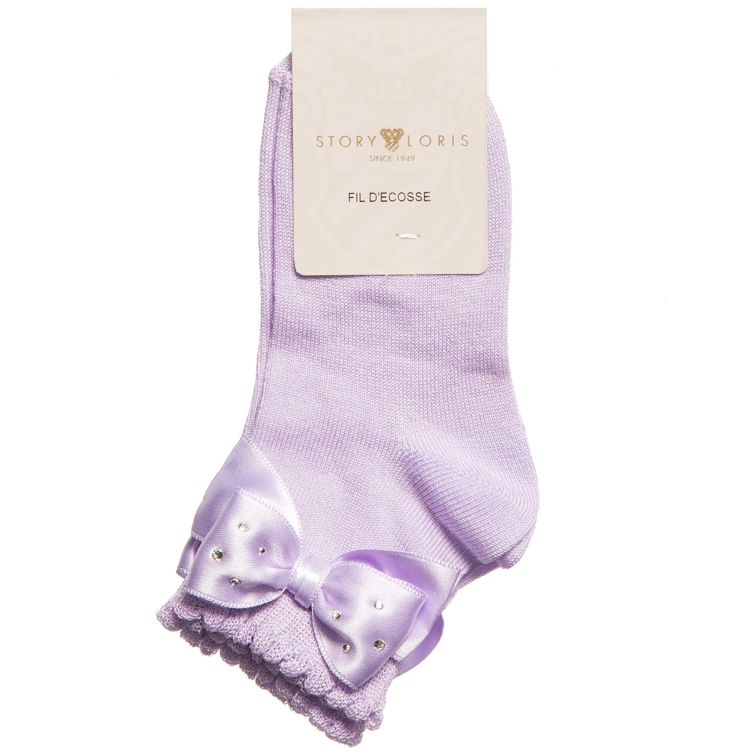 Girls purple socks by Story Loris. Finely knitted in a cotton blend, they are decorated with a satin bow embellished with diamanté and have a softly scalloped ankle cuff.
