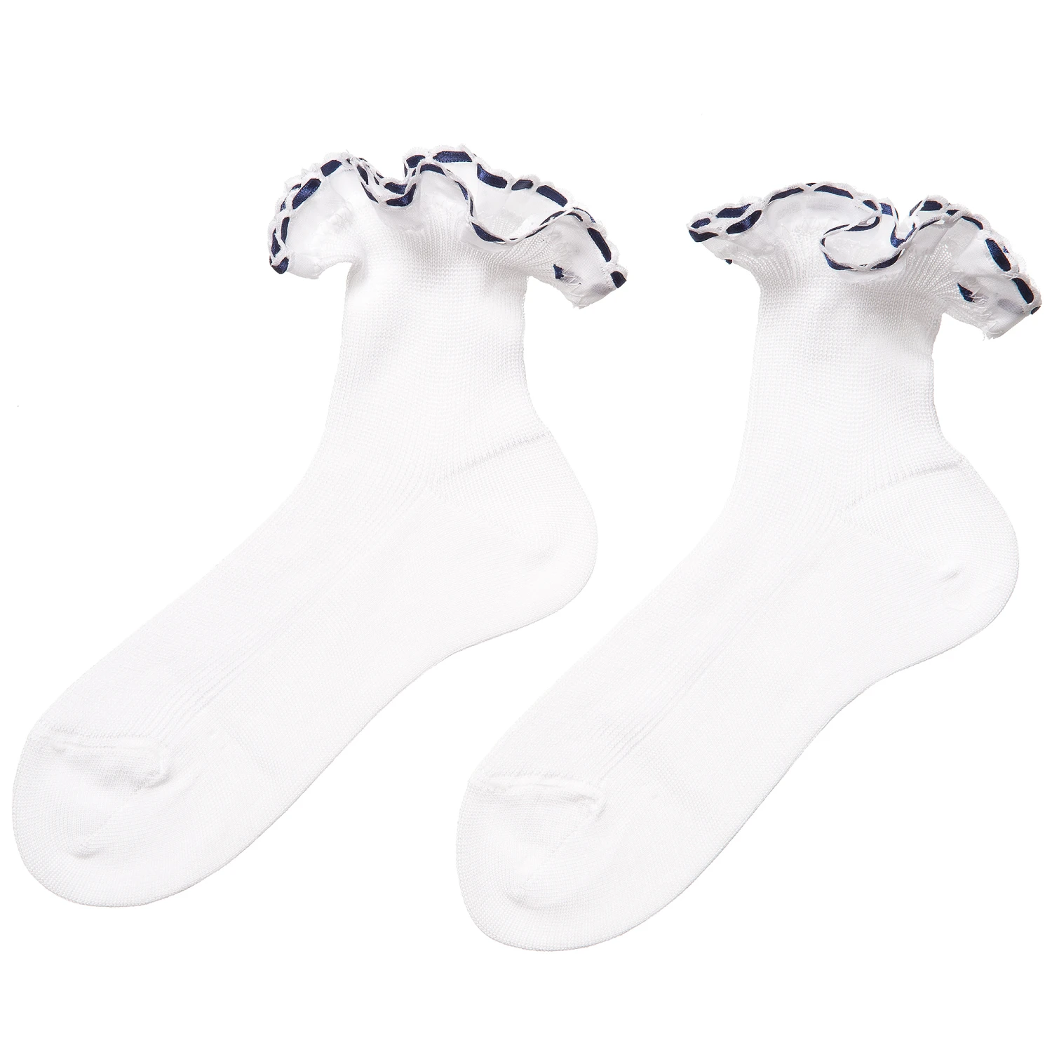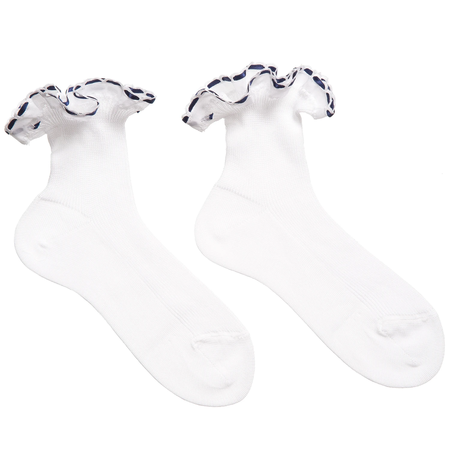 Girls white cotton socks with blue ribbon ruffles by Story Loris. Finely woven in soft cotton, these pretty socks have delicate organza and navy blue ribbon ruffle trims at the ankles.