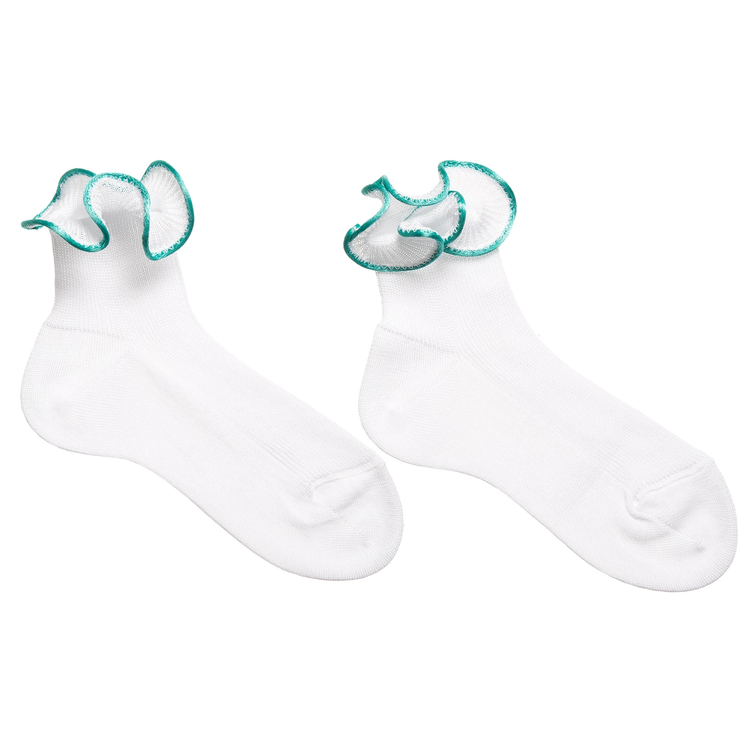 Girls white and green ruffle socks by Story Loris. These super fine weave socks are made in pure cotton and have a delicate ruffle trim, edged in turquoise green.