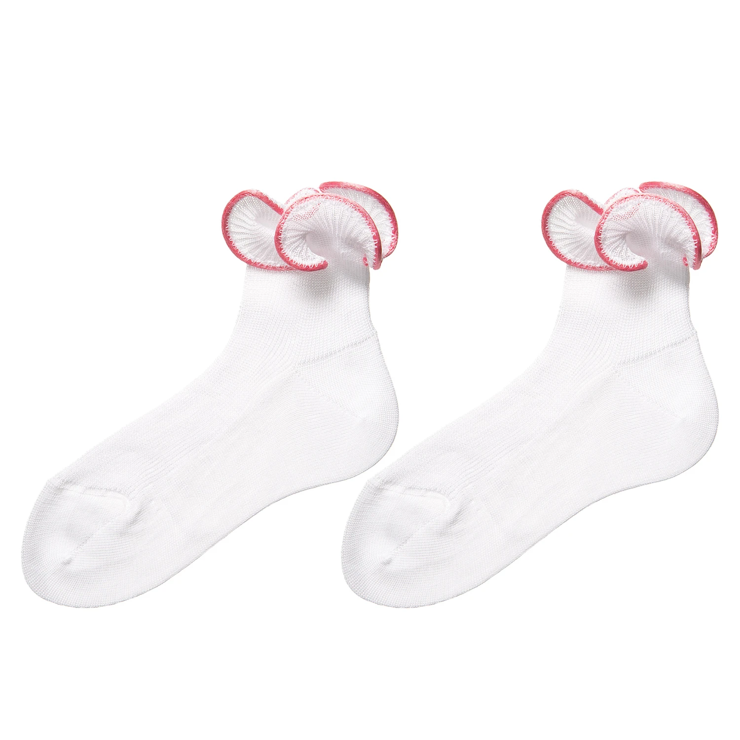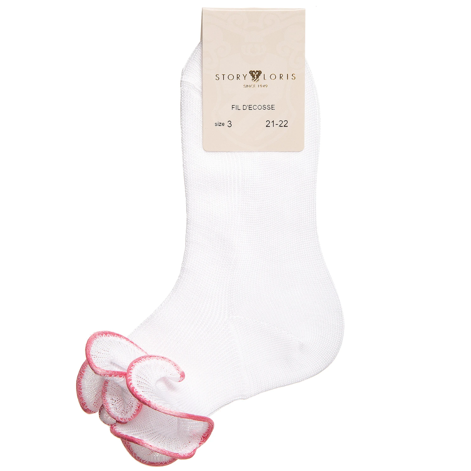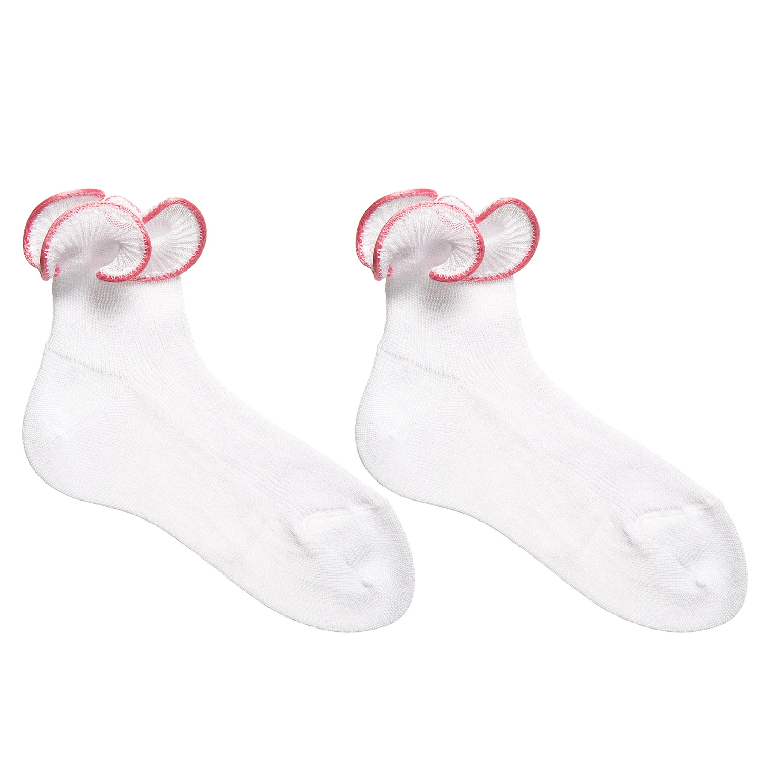 Girls white and dark pink ruffle socks by Story Loris. These super fine weave socks are made in pure cotton and have a delicate ruffle trim, edged in dark pink.