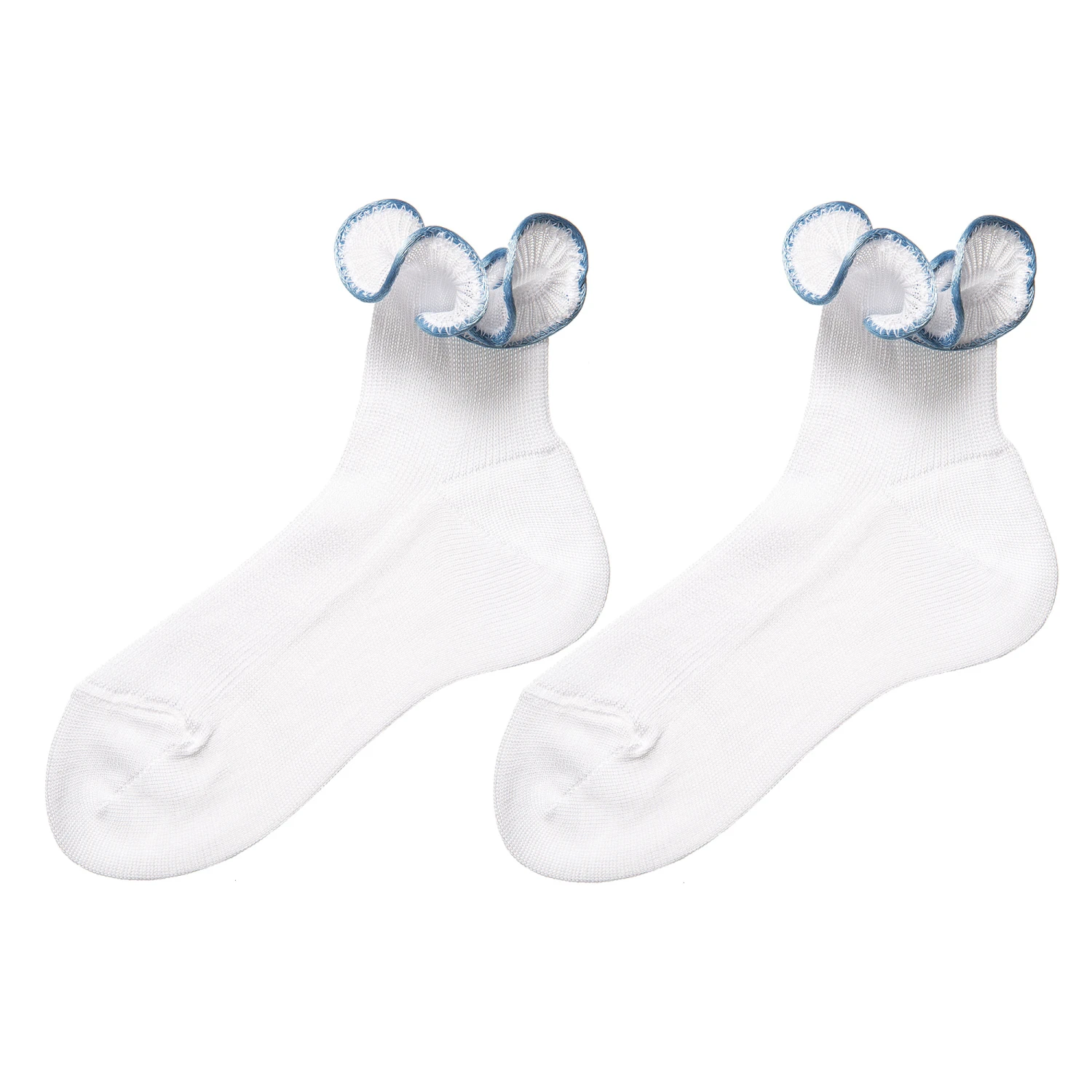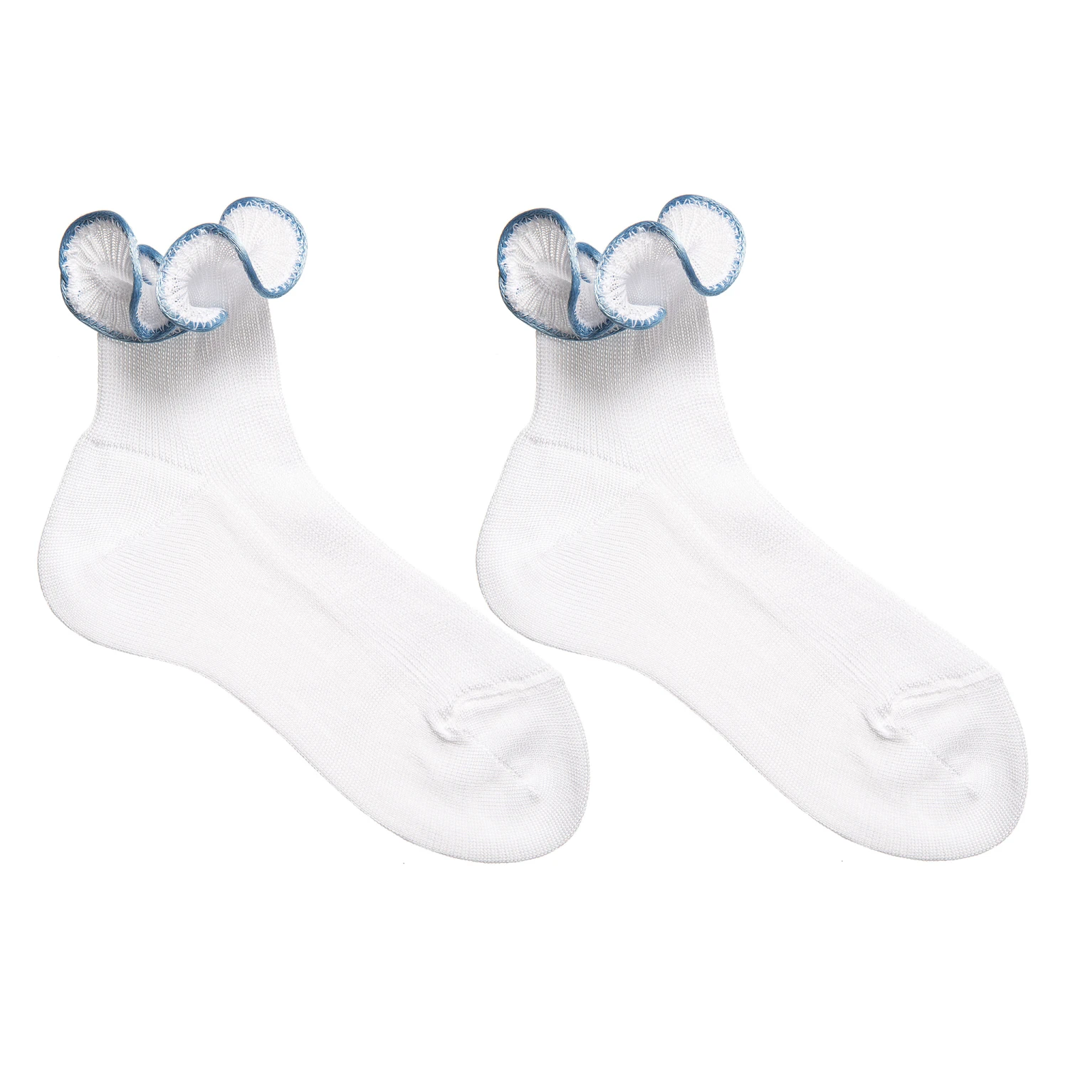Girls white and sky blue ruffle socks by Story Loris. These super fine weave socks are made in pure cotton and have a delicate ruffle trim, edged in light blue.