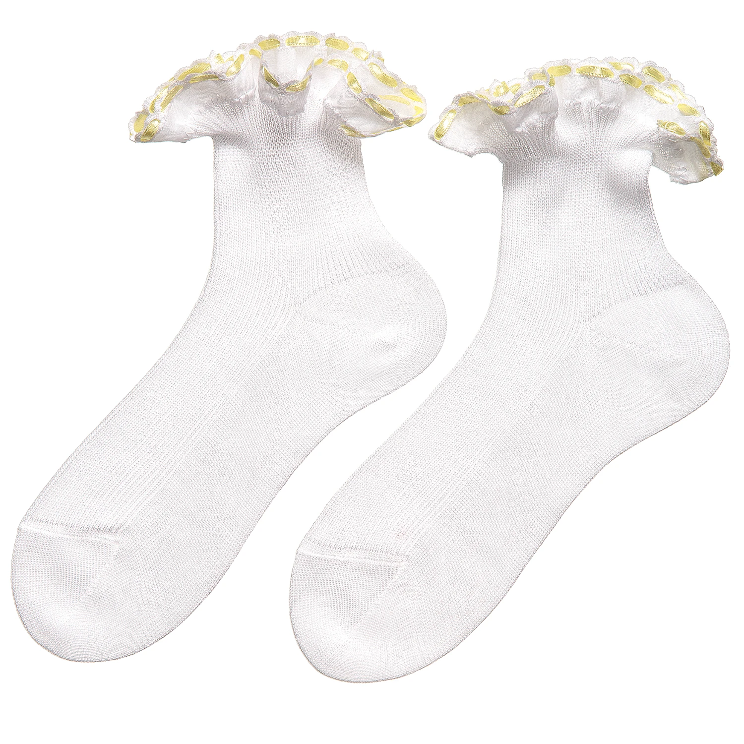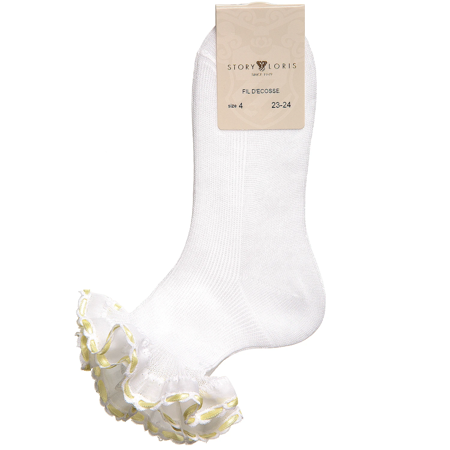 Girls white cotton socks with yellow ribbon ruffles by Story Loris. Finely woven in soft cotton, these pretty socks have delicate organza and yellow ribbon ruffle trims at the ankles.