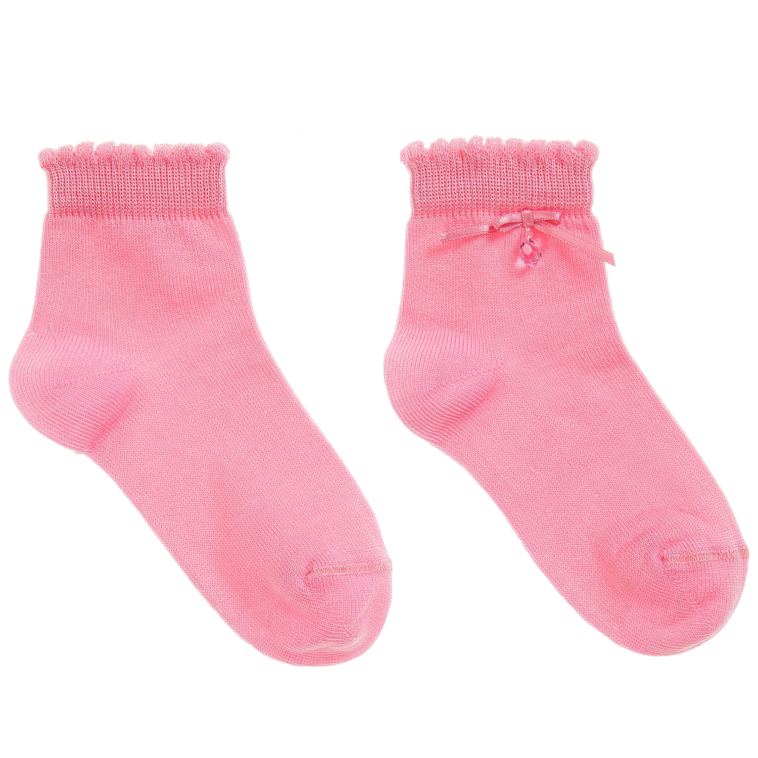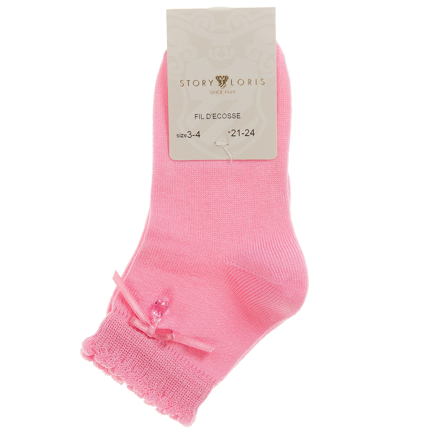 Girls fine knit socks by Story Loris in rose pink cotton with a bow and bead on the ankle.
