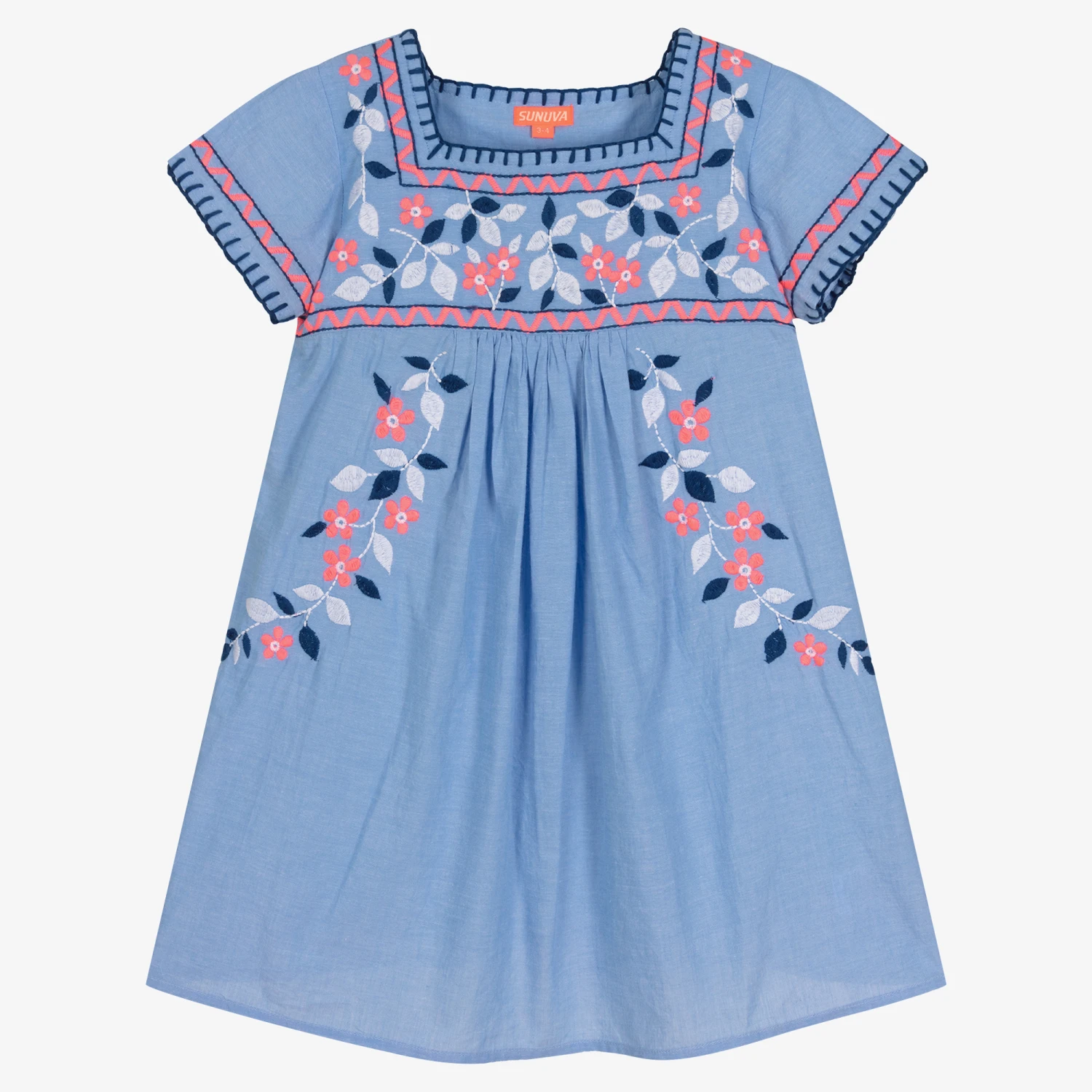 Exclusive to Childrensalon, a light blue cotton cover-up for girls by British brand Sunuva, ideal for the beach or poolside. Soft and lightweight, it has neon pink, navy blue and white floral embroidery on the front, with coordinating navy blue blanket stitch trims. It is gathered below the bodice and easy to wear, simply slipping on over the head.