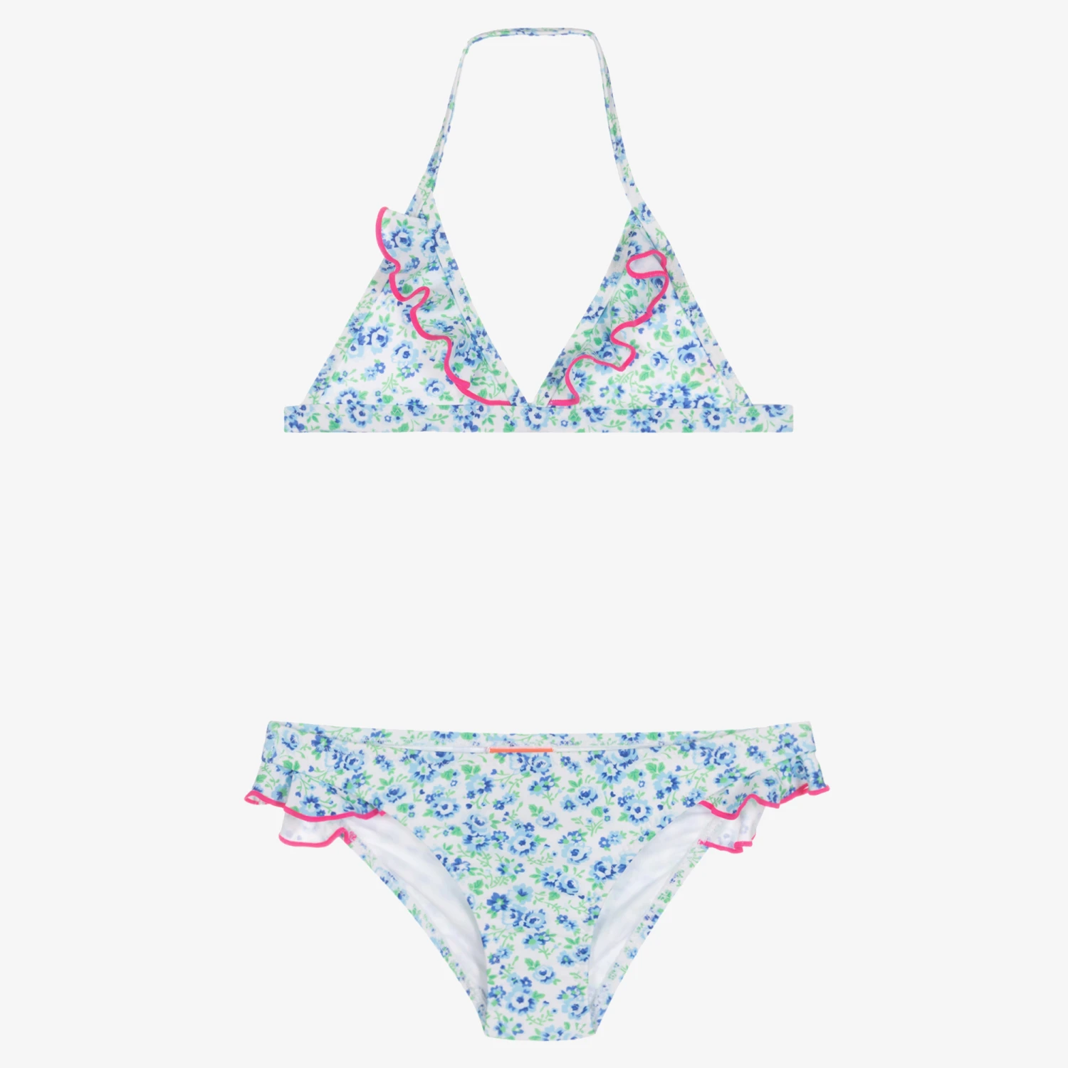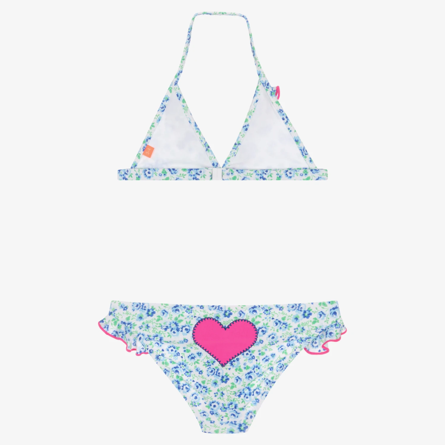 Girls floral bikini for the beach or pool by British swimwear brand Sunuva. It is patterned with blue and green flowers on a white background and has sweet ruffle detailing with pink trims. Made in soft, silky, recycled fabric offering stylish sun protection, it is fully lined for comfort. The top has a halter neck and fastens with a clasp around the back. The bottoms have a cute pink heart appliqué around the back.