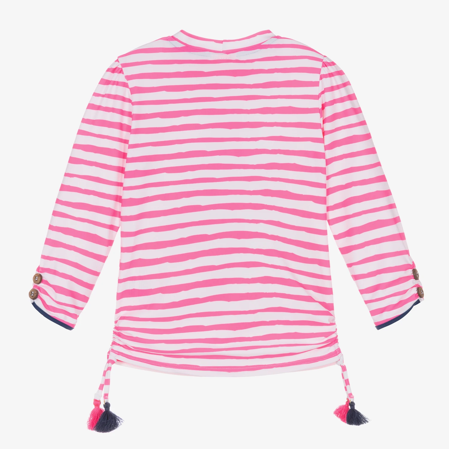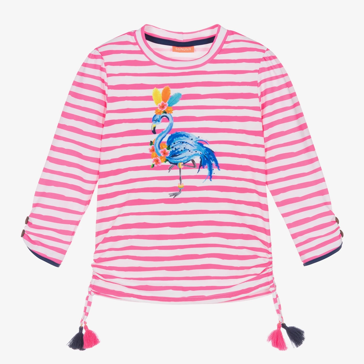 Patterned in pink and white stripes, this swim top for girls is from Sunuva. It is made from a stretchy recycled fabric for comfort, and is long-sleeved to protect the arms. A bright tropical flamingo is printed on the front, with decorative wooden buttons and ruched tassel trims on the sides.