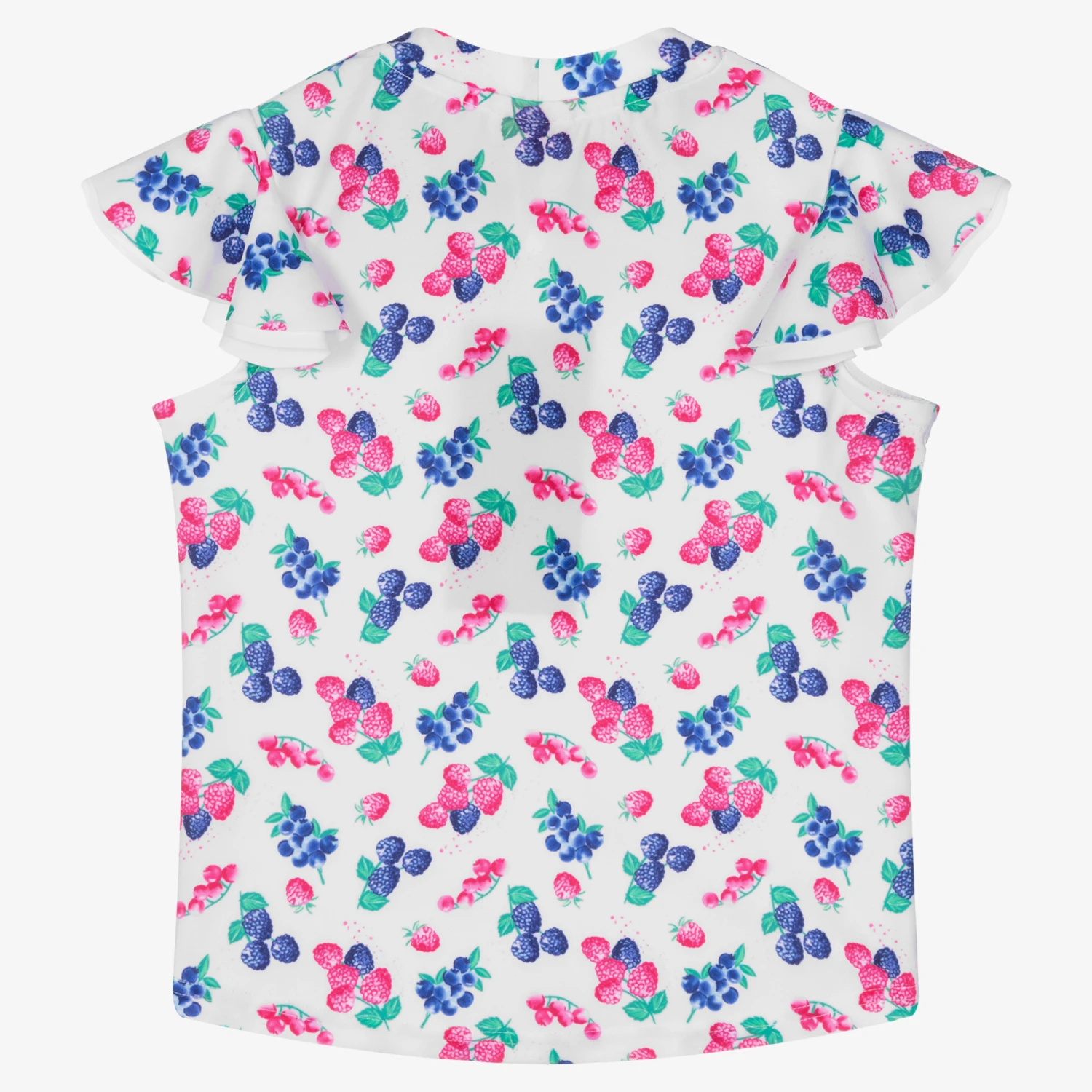 A white swim top for girls by Sunuva, made in a smooth and stretchy recycled fabric. It is printed with lovely pink and blue berries all-over, and has pretty ruffled sleeves. The front is lined for breathable wear when swimming.