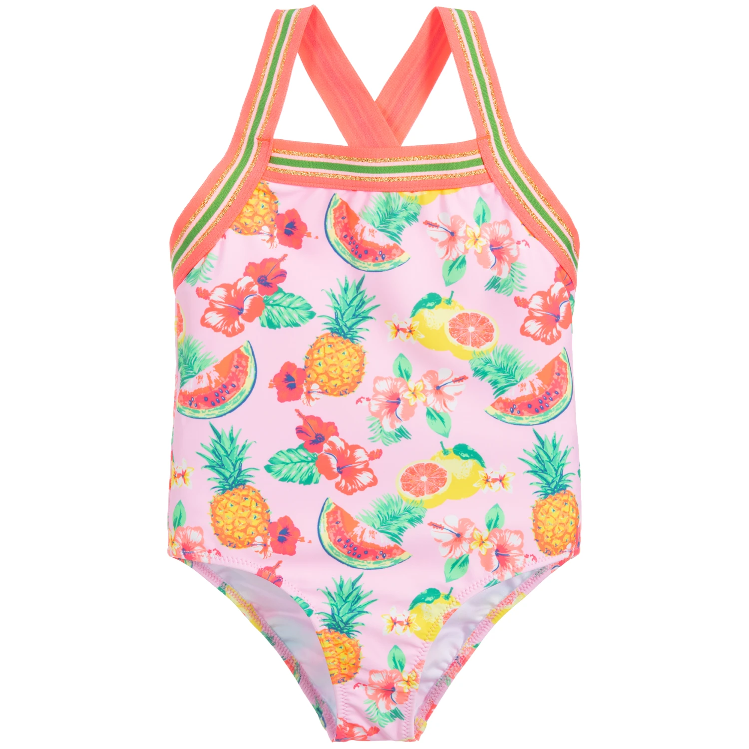 Pretty pink Sunuva swimsuit for girls, with a colourful tropical fruit print. Made in silky smooth fabric and fully lined, it has UPF50+ sun protection. The contrast pink straps and trim are elasticated with green, white and sparkly gold stripes.