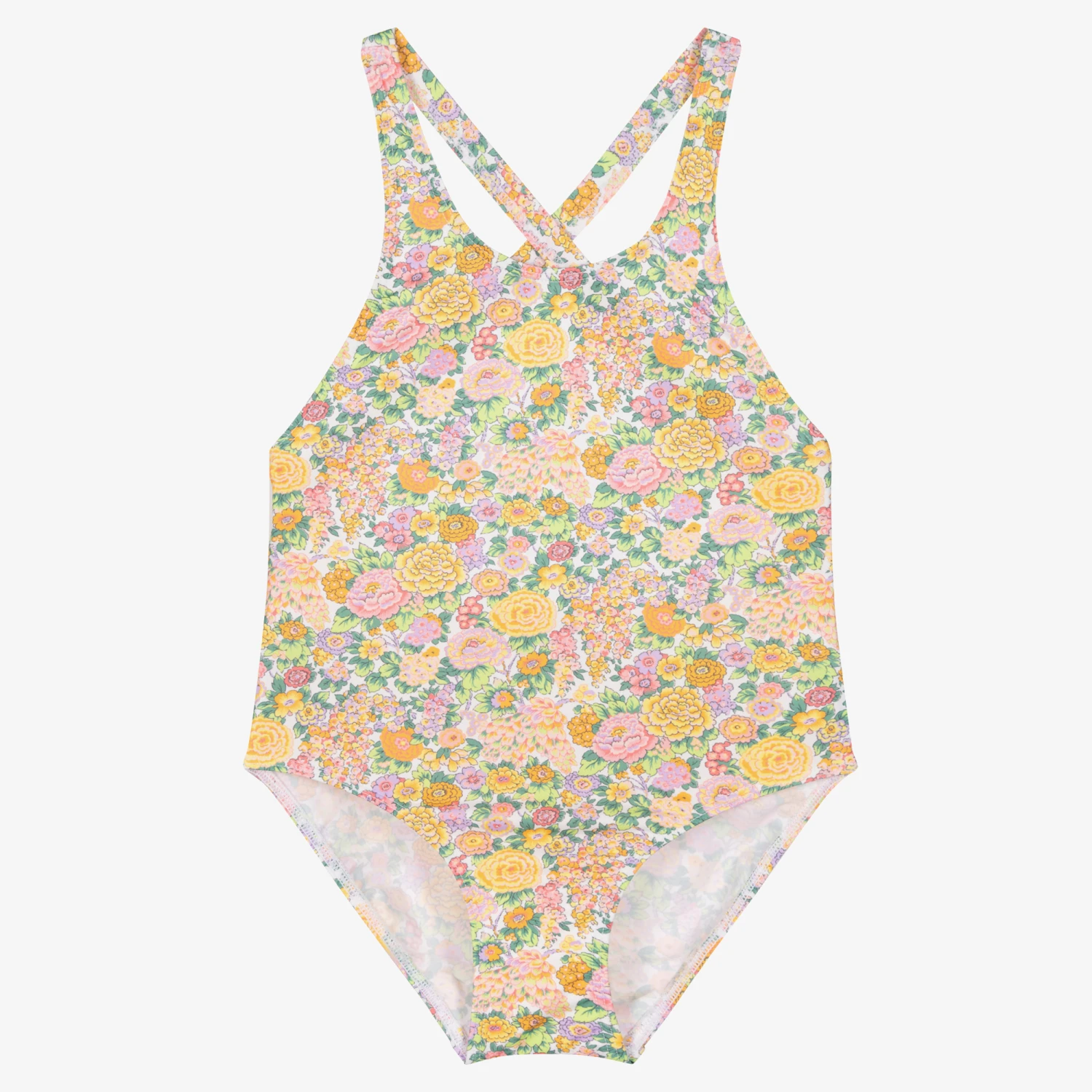 Pink, yellow and green swimsuit for girls by Tartine et Chocolat, designed in a beautiful floral Liberty print. Great for the pool or beach, this cute one-piece has pretty ruffle trims layered on the back and thin crossover straps.