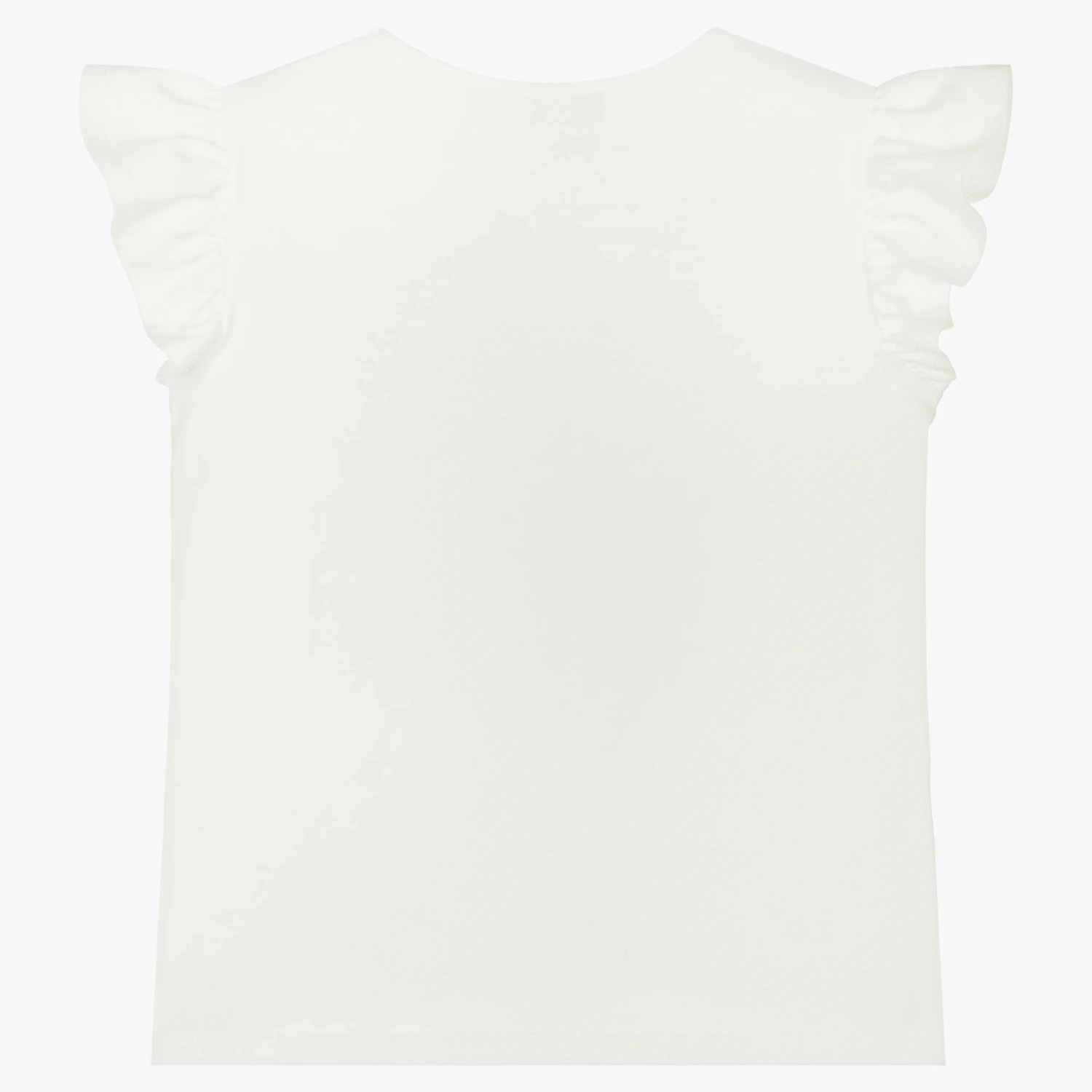 Cute ivory T-shirt for girls from Tartine et Chocolat, made from soft and stretchy cotton jersey. It has delicate ruffles on the sleeves and an abstract heart appliqué made from pink floral Liberty print fabric, with the word “amour” embroidered in the middle.