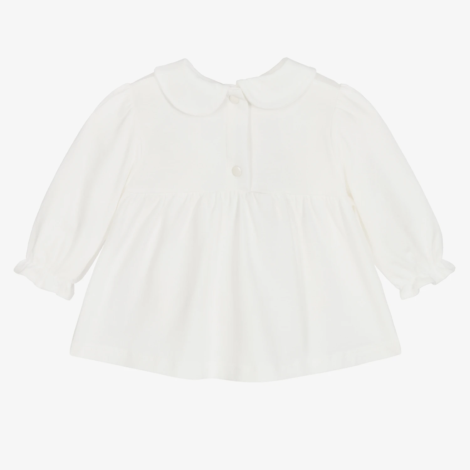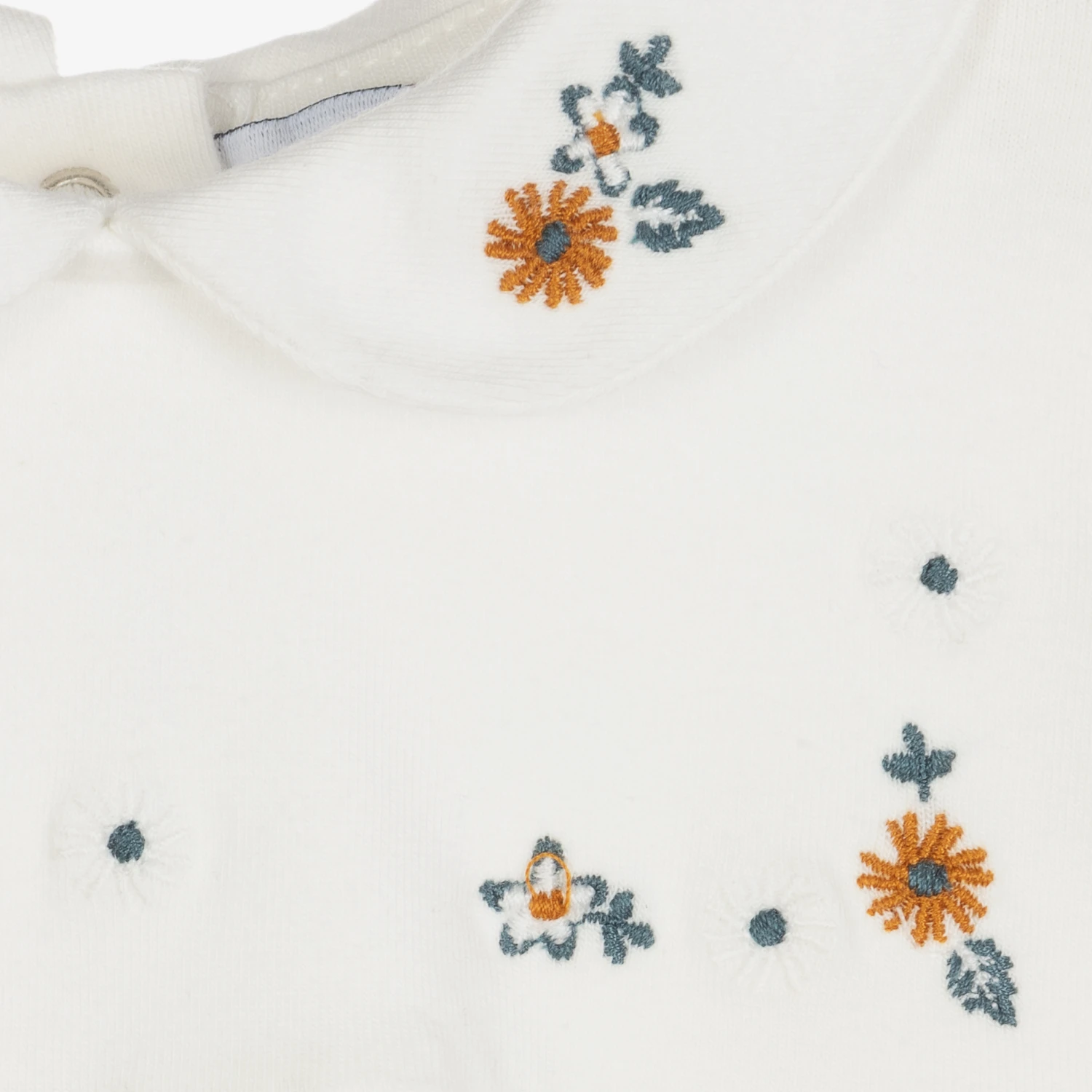 Ivory blouse for little girls by Tartine et Chocolat, made in soft, stretchy cotton and modal jersey. It is embroidered with flowers in blue and mustard yellow and the hem is trimmed with a pearly logo tab. It has a rounded collar and back popper fastenings.