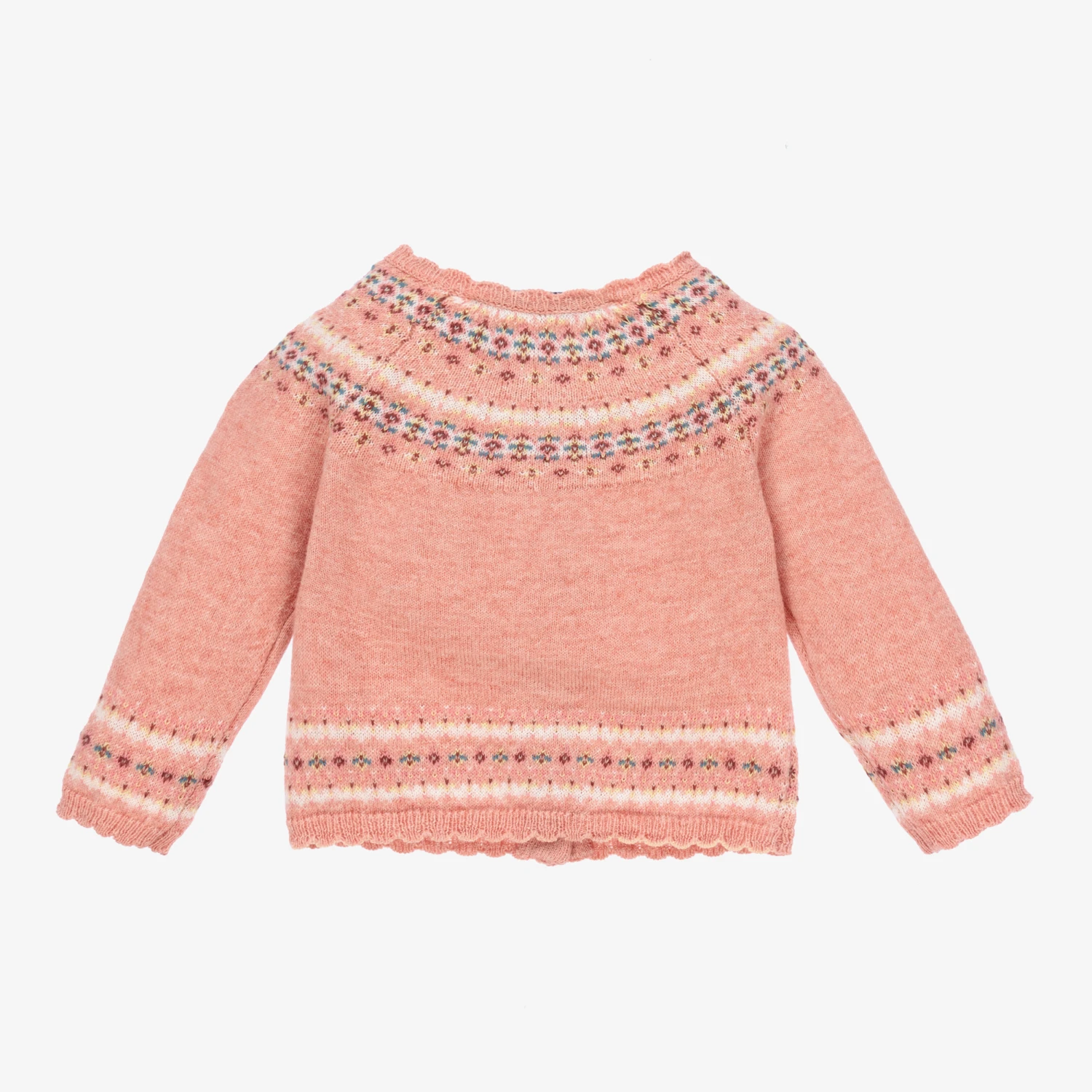 Pink cardigan for little girls, by Tartine et Chocolat. Made from soft wool and cashmere blend, it has a pretty white, blue and pink knitted detail and sweet picot trims.