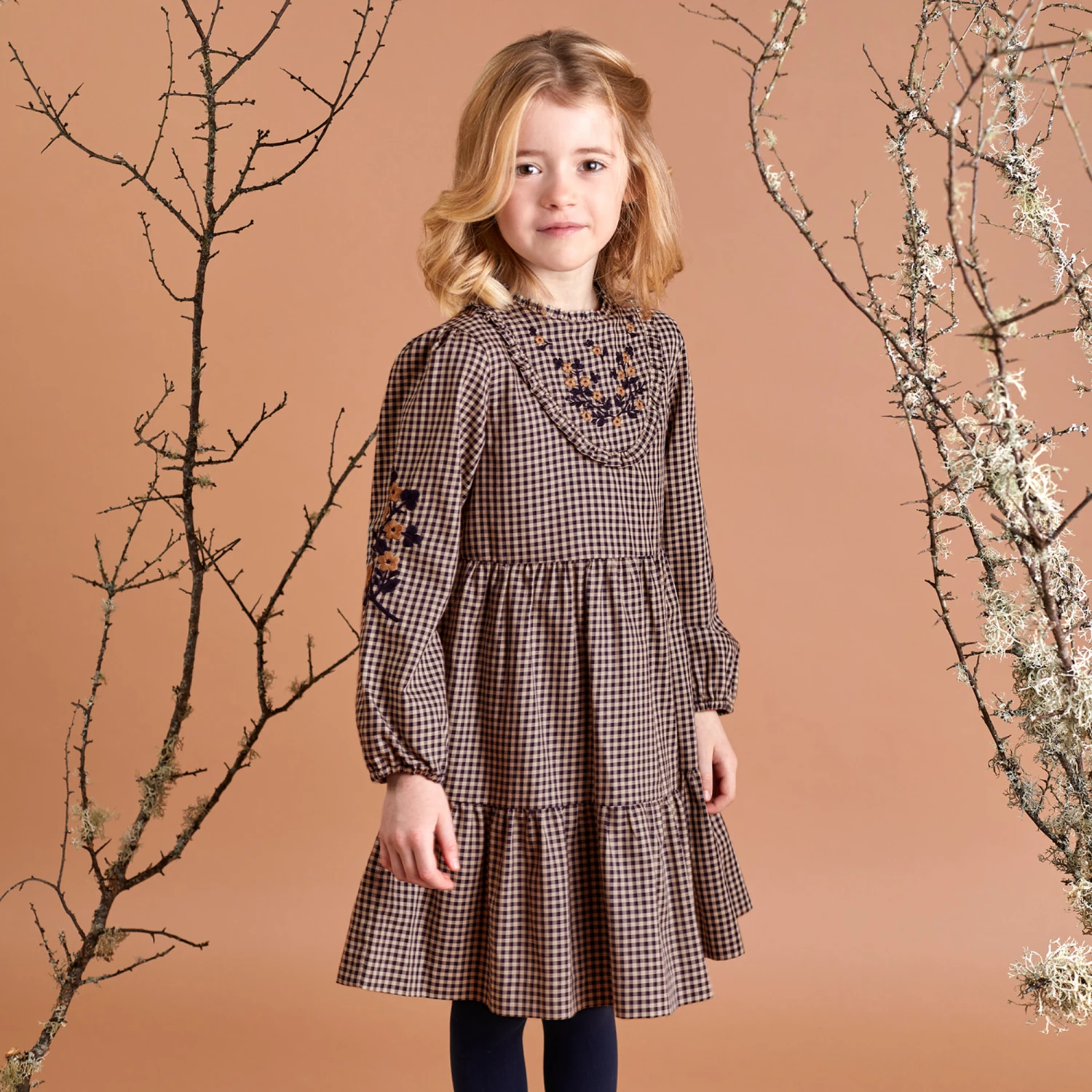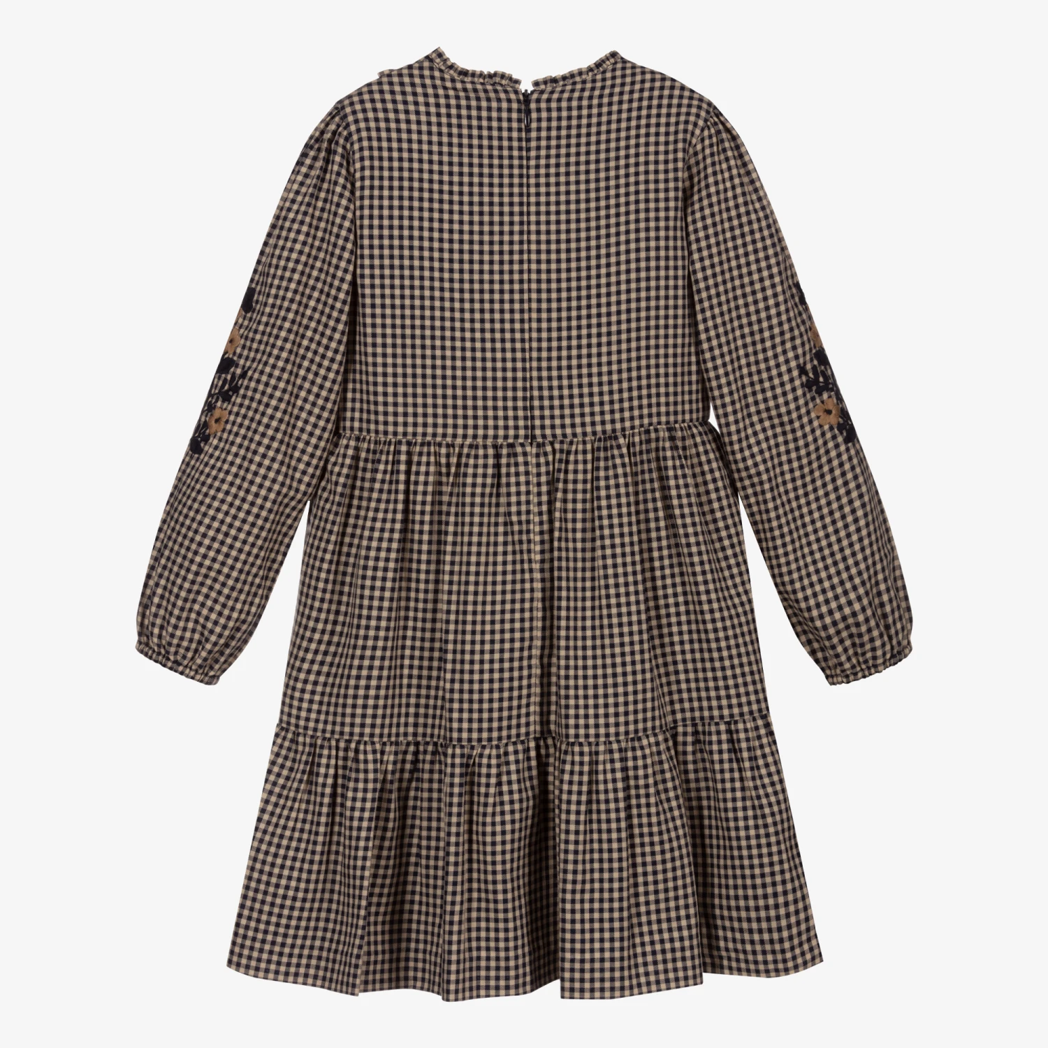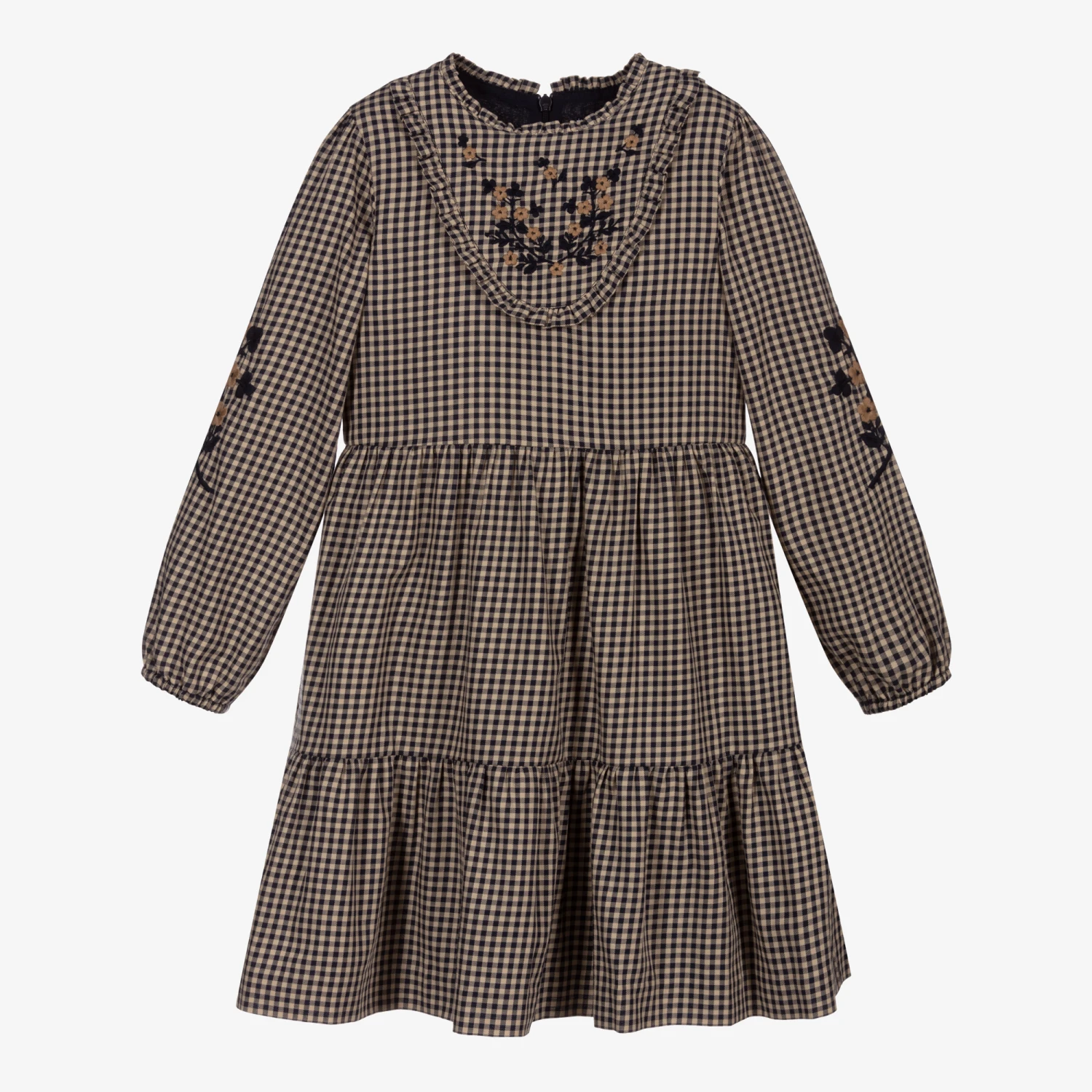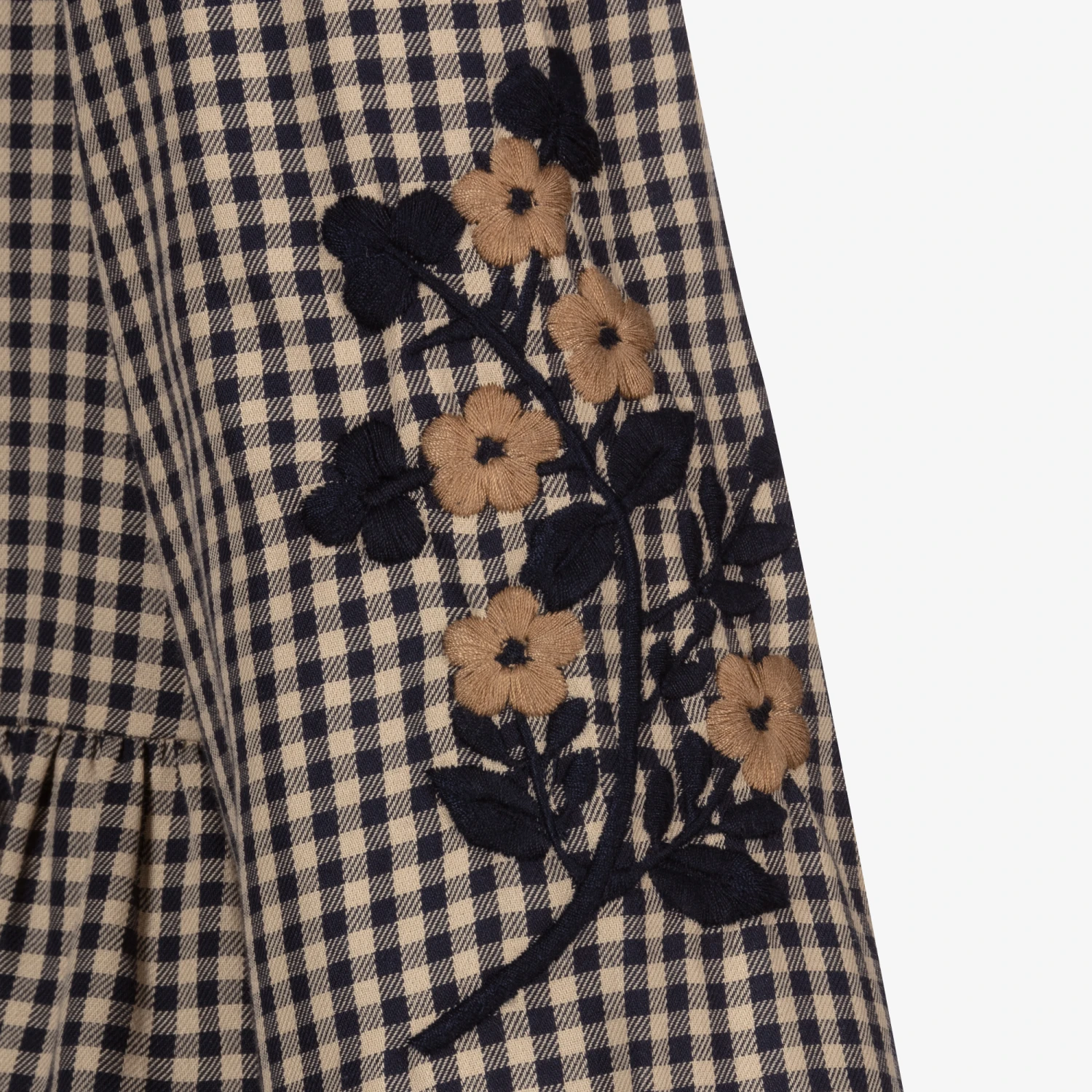 Navy blue and beige check dress for girls by luxury brand, Tartine et Chocolat. Made with soft, lightweight cotton, this smart dress has pretty embroidered flowers on the frill-trimmed bodice and sleeves and an elegant tiered skirt. Lined with navy blue cotton voile, it fastens with a concealed zip on the back.