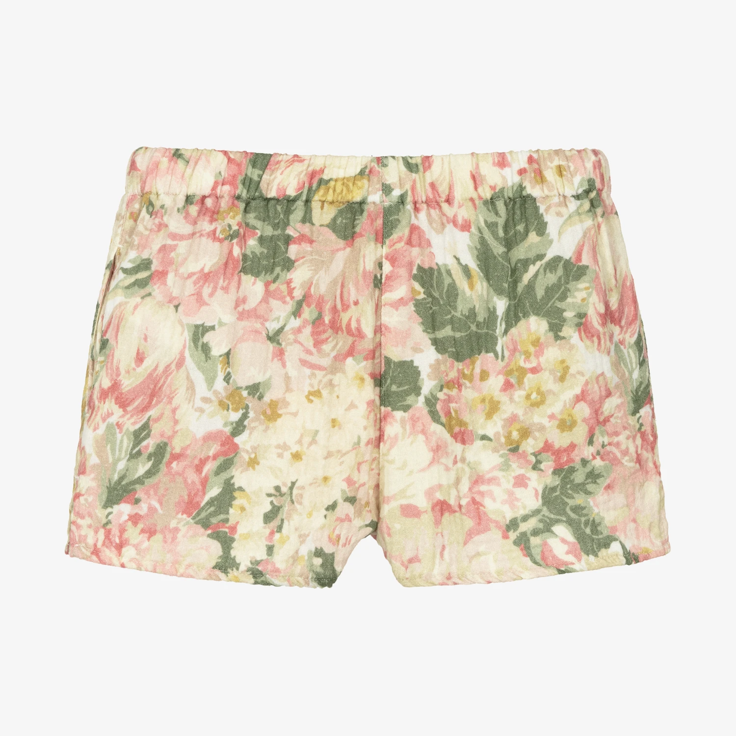Beautiful beige shorts for girls by The Animals Observatory, woven in soft, lightweight, textured cotton. These shorts are patterned in a green, pink and deep yellow vintage floral design. The brand’s quirky diamond logo is embroidered in green on the front. They pull on easily with a stretchy elasticated waistband and have useful, concealed side pockets.