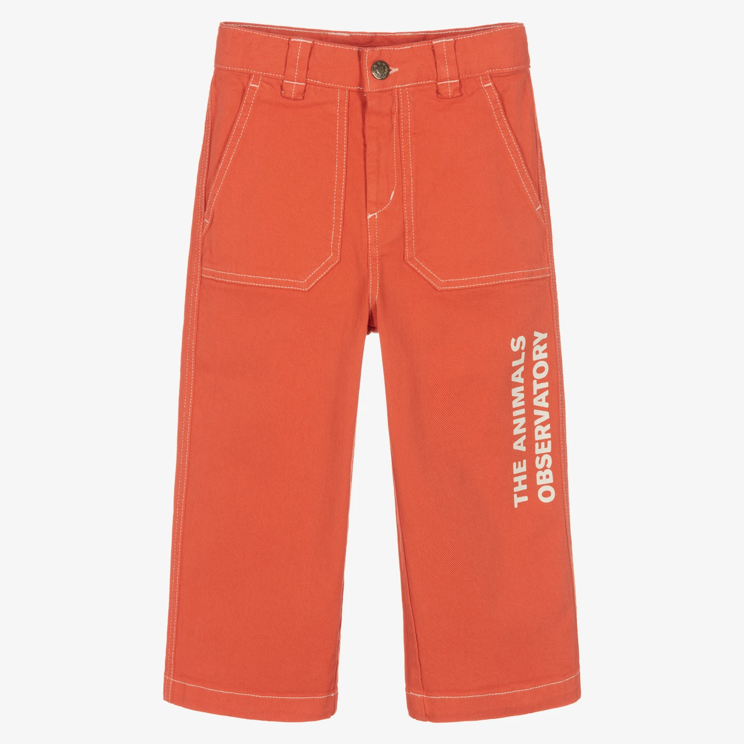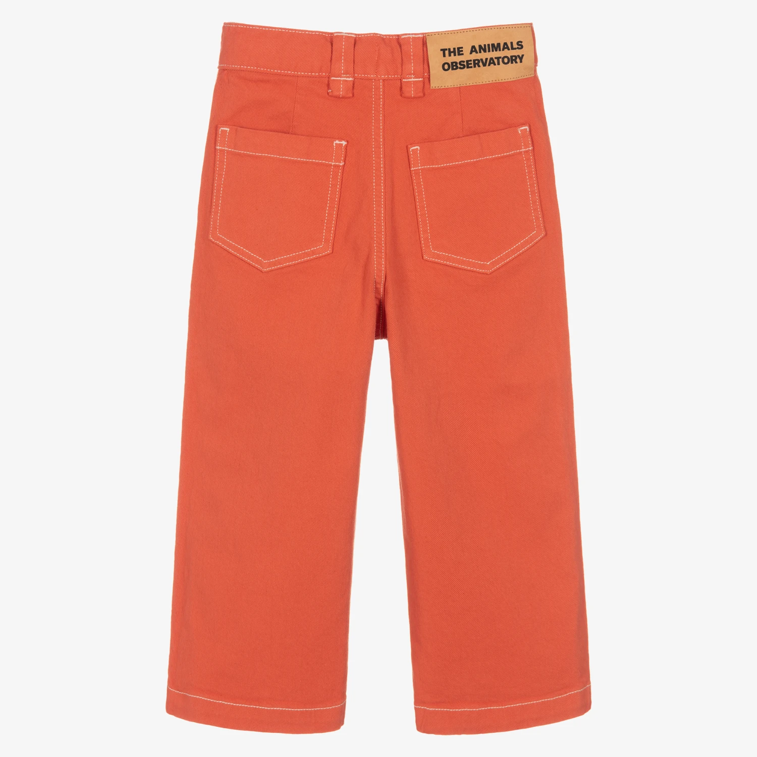 Coral red jeans for girls by The Animals Observatory, made in recycled cotton denim with added stretch for flexibility. With a branded jacron patch on the back, this cropped, wide leg style has spacious pockets on the hips for a relaxed look. White topstitching coordinates with the bold logo print on the leg for instant brand appeal. They fasten with a button and zip and have an adjustable waistband for a preferred fit.
