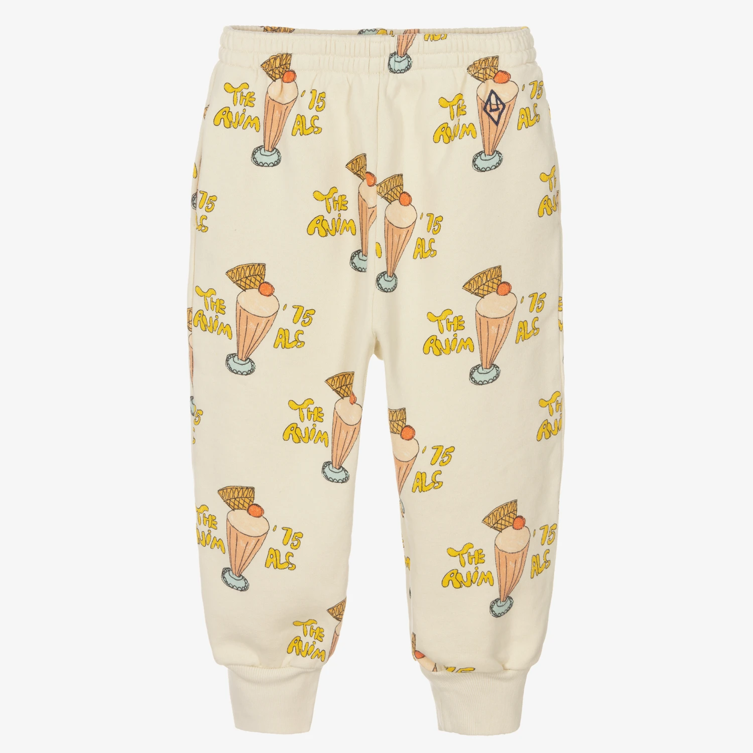 Eye-catching ivory joggers for boys and girls from The Animals Observatory, with a fun milkshake logo pattern in pink, yellow and blue. Made in soft cotton sweatshirt jersey, these cuffed joggers have a comfortable elasticated waist and concealed side pockets.