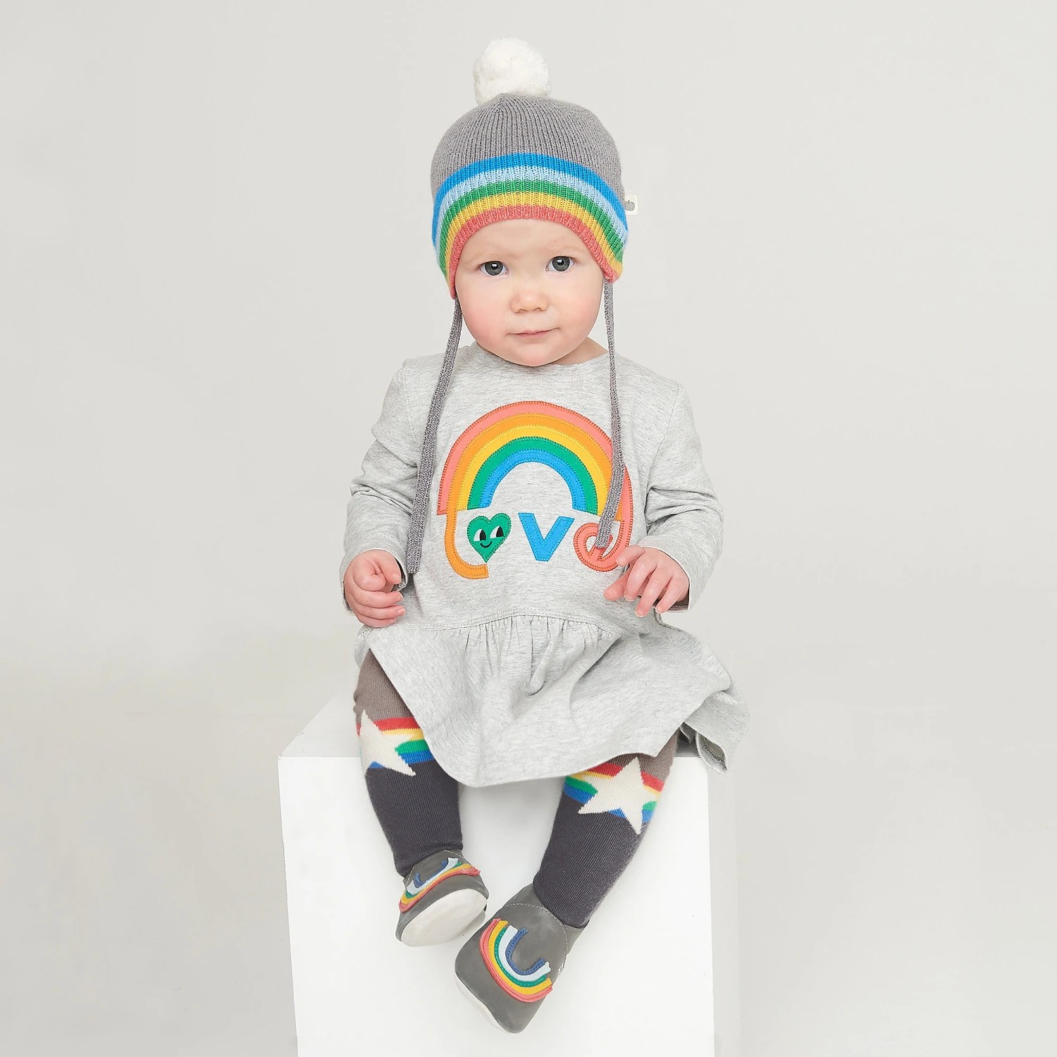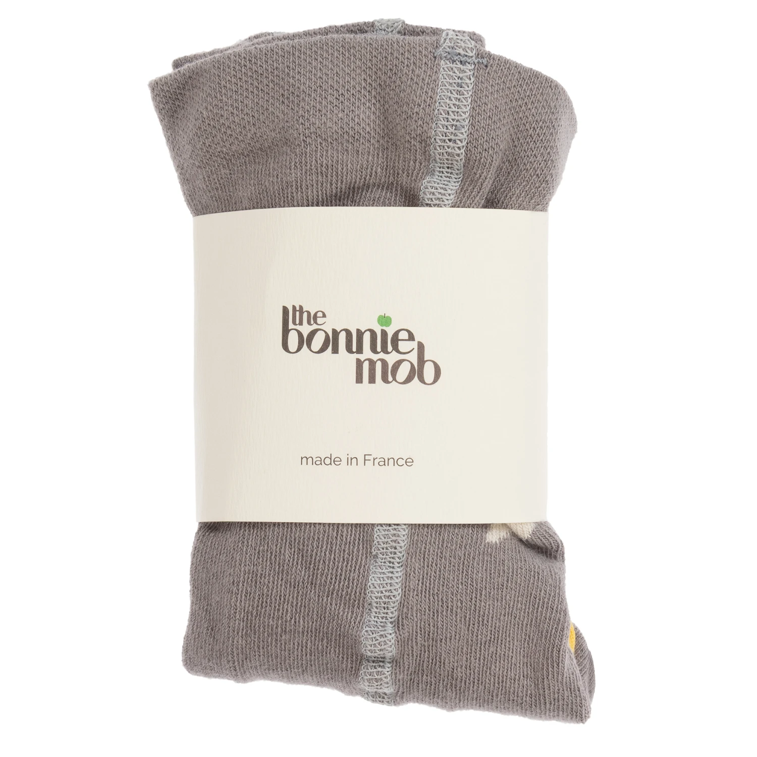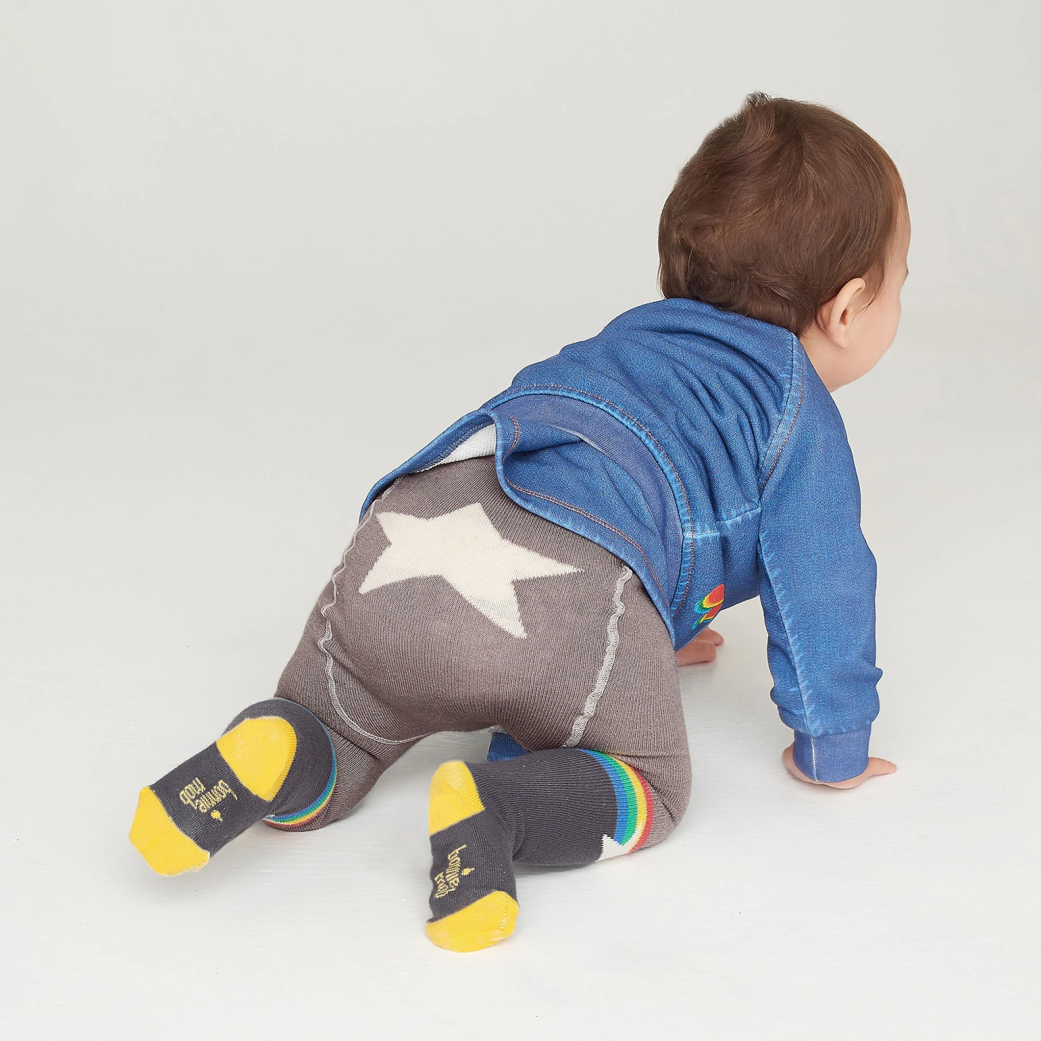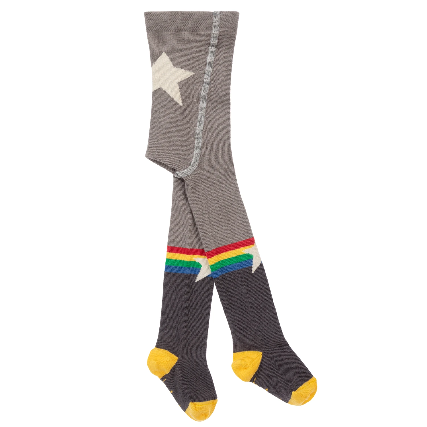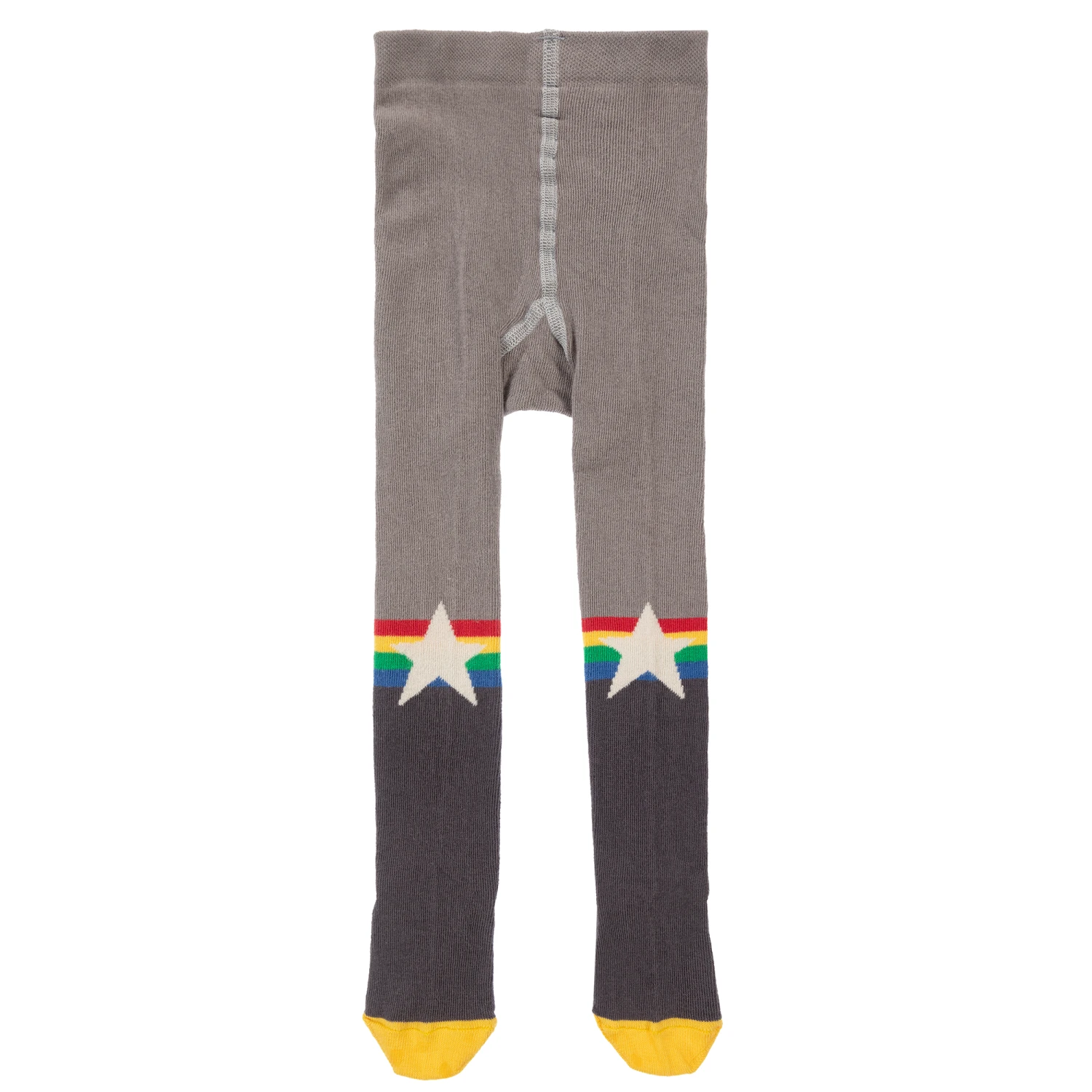 The Bonnie Mob’s light and dark grey tights are designed for baby girls. They are made is soft, hard-wearing cotton blend with reinforced toes and heels. They have a rainbow and white stars on the calves and bottom and a logo on the bottom of each foot.