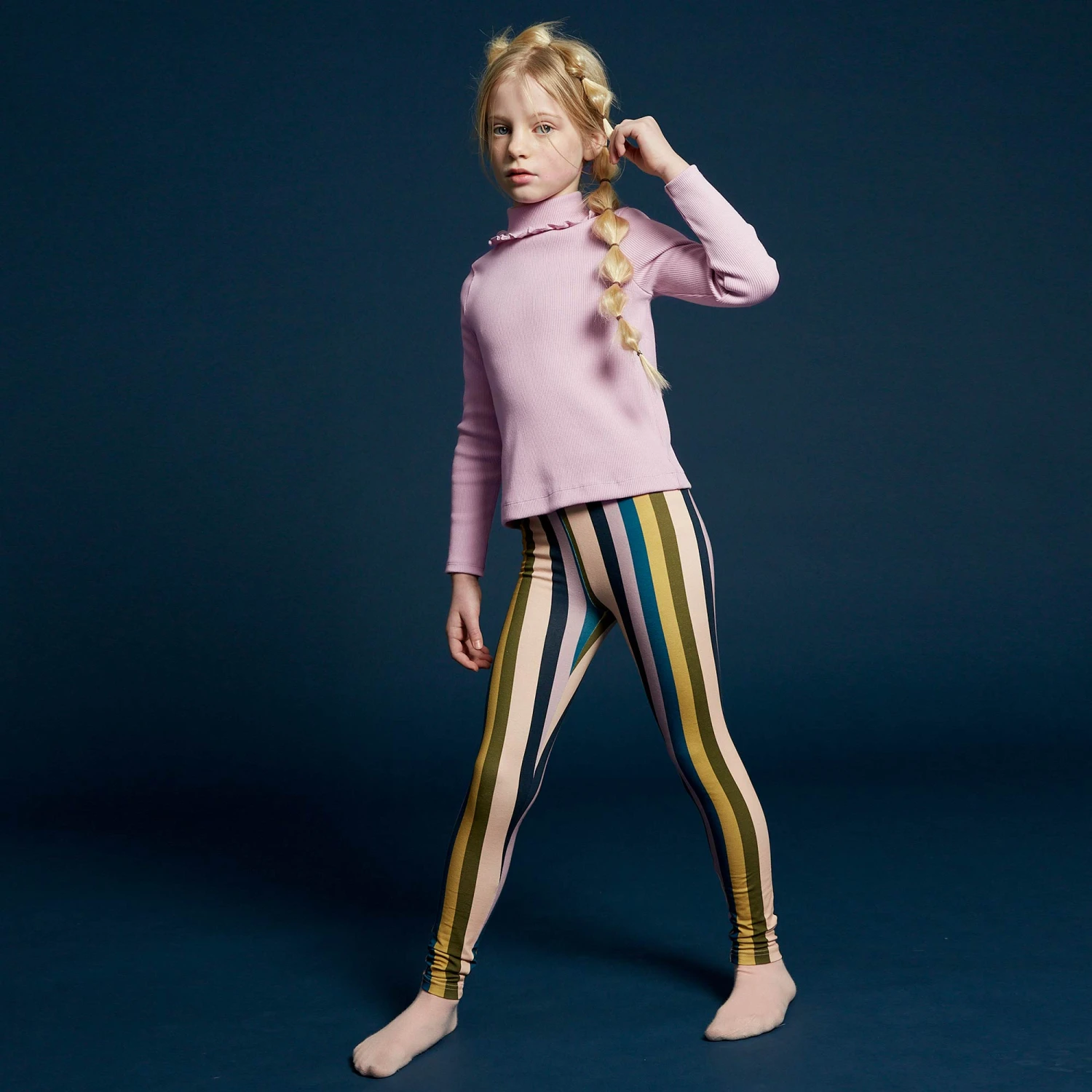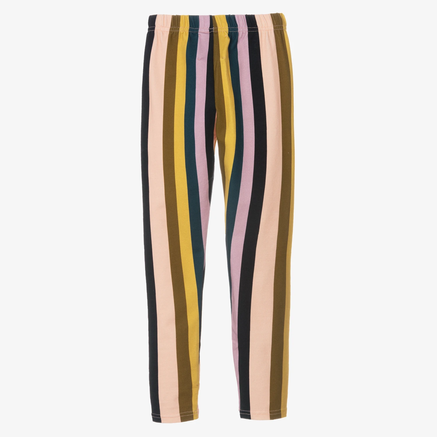 Fun leggings for girls by British designer The Middle Daughter, with a striped print exclusive to the brand. Full length with blue, pink, purple and yellow stripes of different widths, they are made in comfortable cotton jersey. A versatile piece for the wardrobe, they would work equally well paired with a T-shirt, sweater or dress.