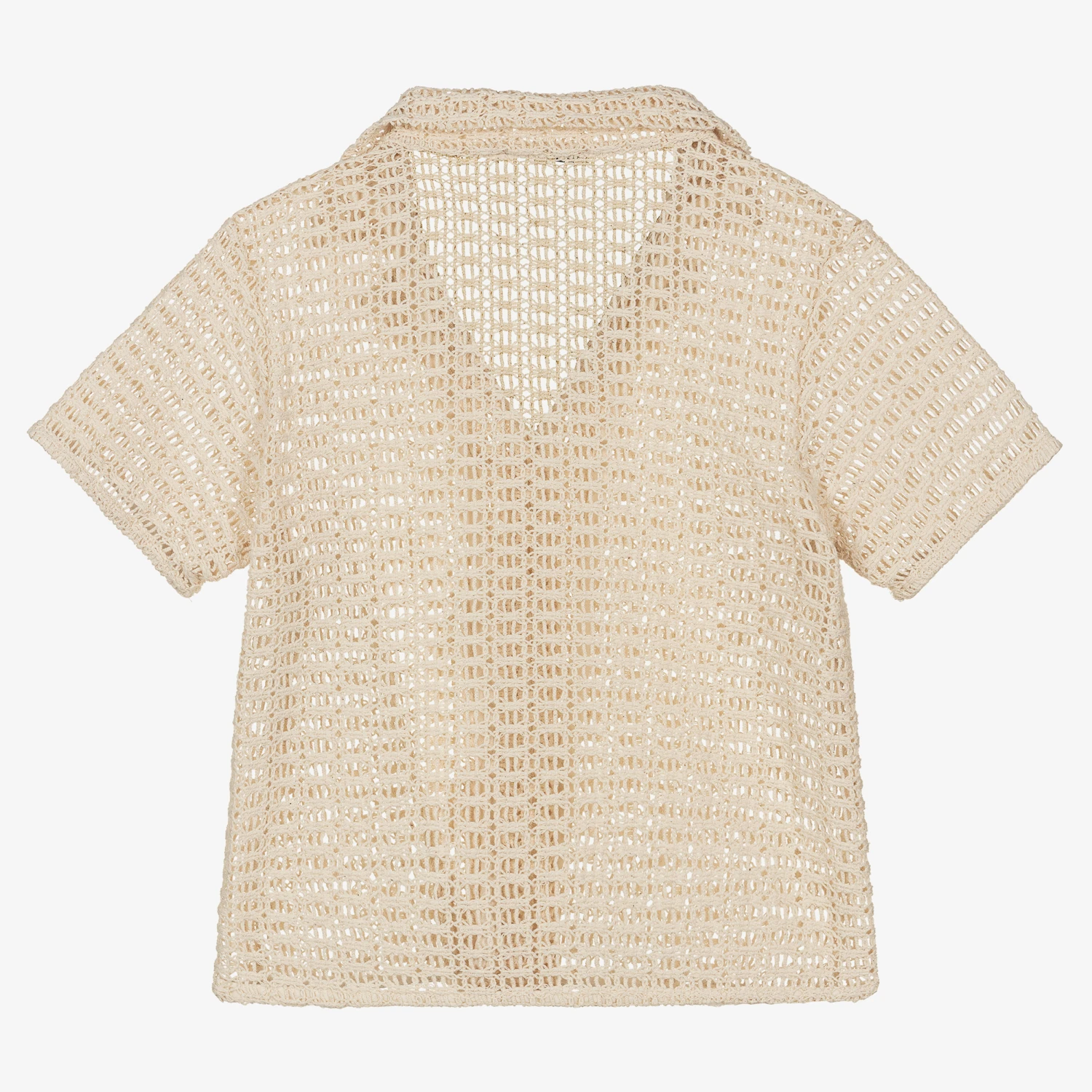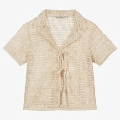 This beige crochet shirt for girls is from The New Society. Great for layering, this quirky piece is intricately crocheted in soft organic cotton with a smart collar. It fastens with woven ribbons to tie into bows on the front.