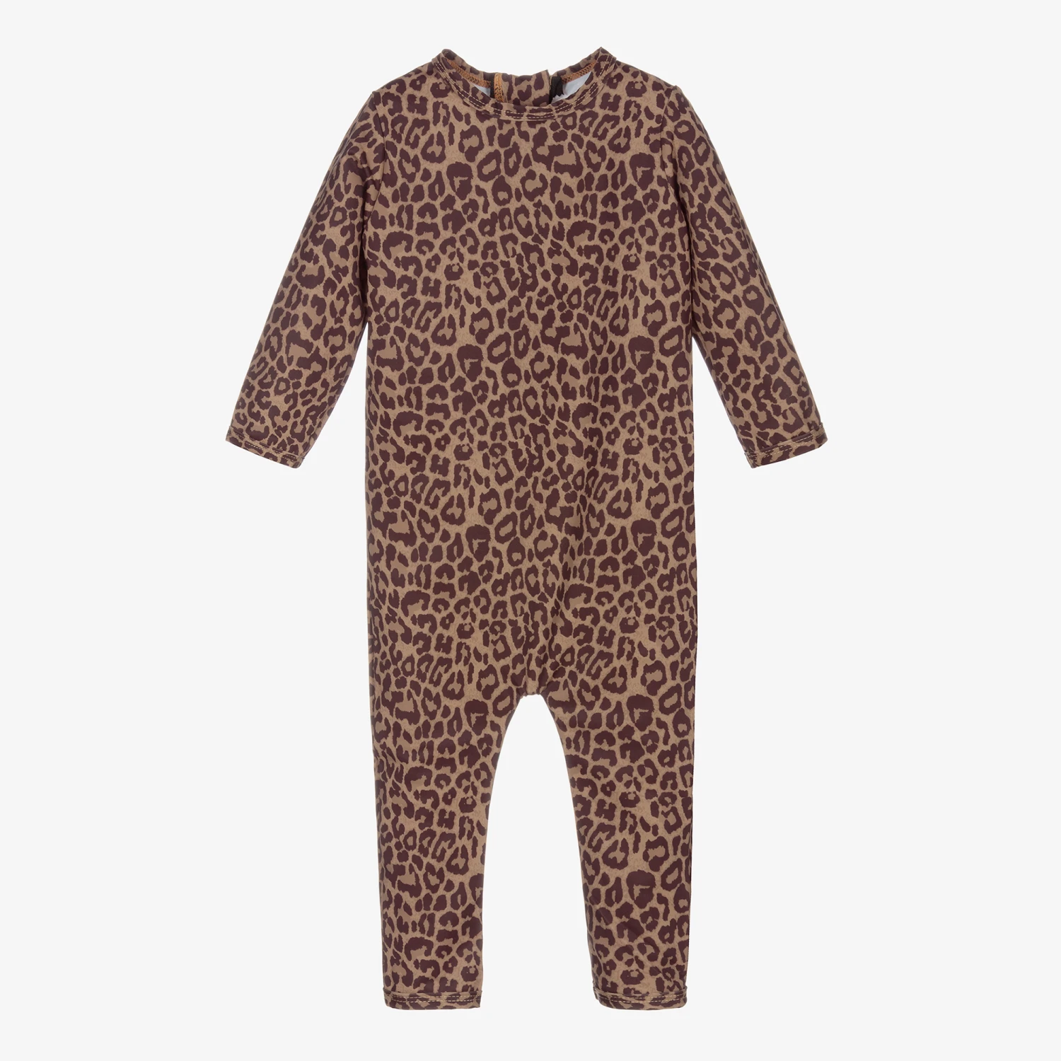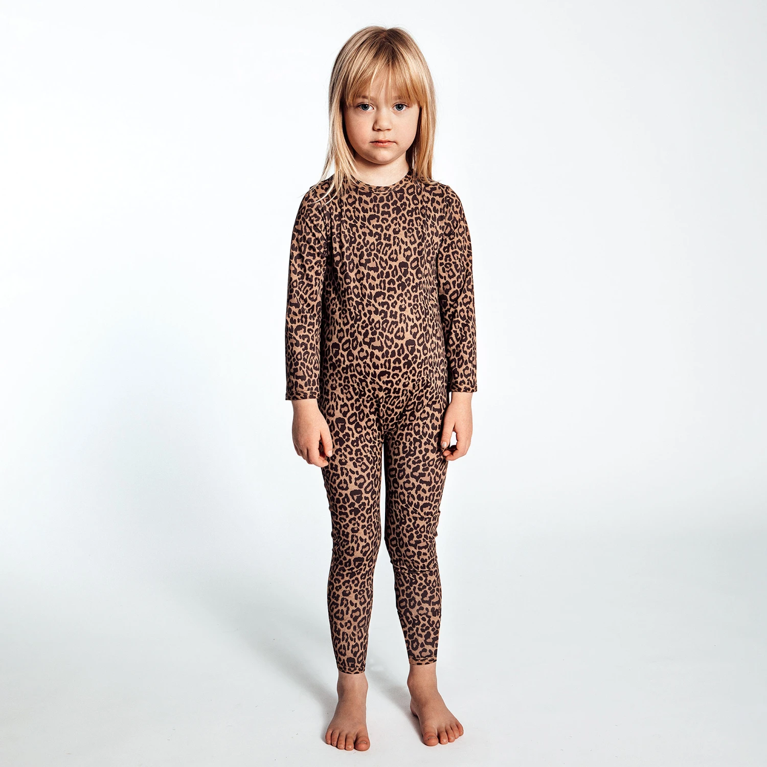 Long-sleeved sun suit for girls by The Tiny Universe, in a brown leopard print. Silky smooth and stretchy, it has UPF50+ protection, just right for swimming and playing in the sun. There is a zip fastening on the back, together with the brand’s embroidered logo patch.