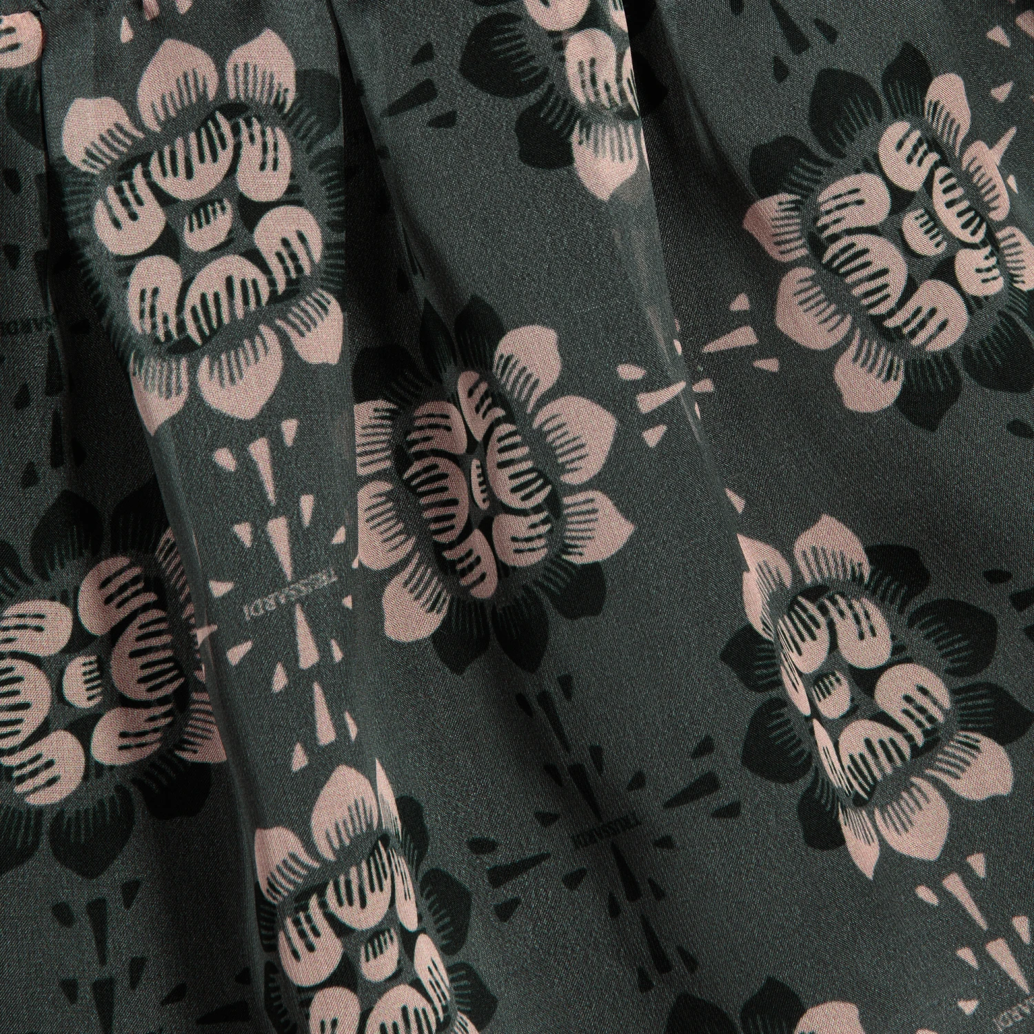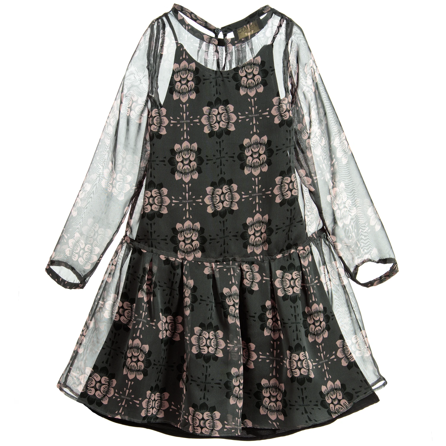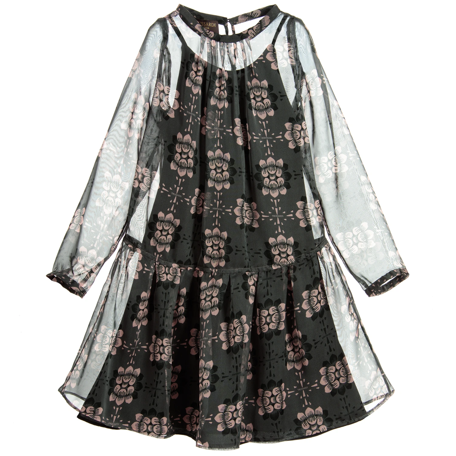 Soft, lightweight and floaty, this chiffon dress from Trussardi is an elegant dress for smart occasions. In a shade of charcoal grey, the fabric has a pink floral print, with sheer sleeves and an attached slip underneath, with a single button closure at the back of the neck.