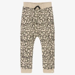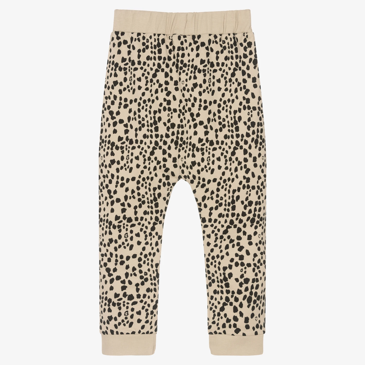 Beige joggers for boys and girls by Turtledove London, made in soft organic cotton jersey. They have a black animal spot all-over print and an elasticated waist with a black drawstring tie for a comfortable fit.
