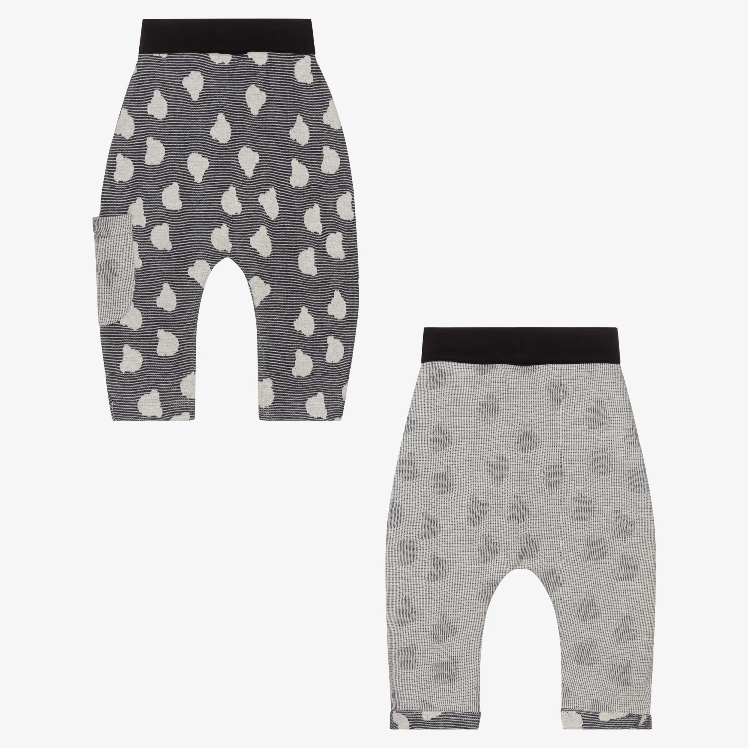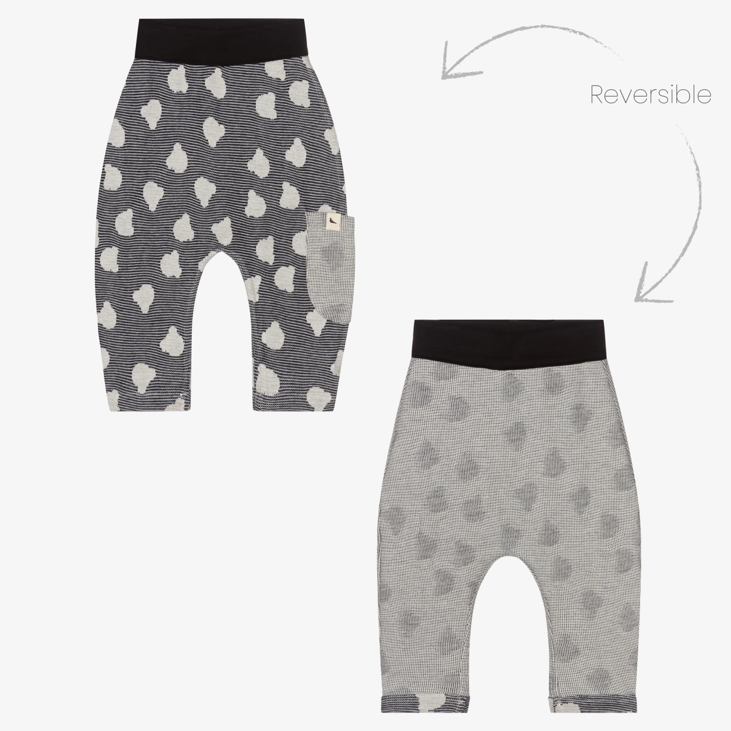 Reversible ribbed jersey joggers for little boys and girls by Turtledove London, made in soft organic cotton. One side has black and grey stripes, with an all-over jacquard cloud print and a patch pocket on one leg. The other side is grey, with black and grey striped ankle cuffs. There is a black elasticated waistband.
