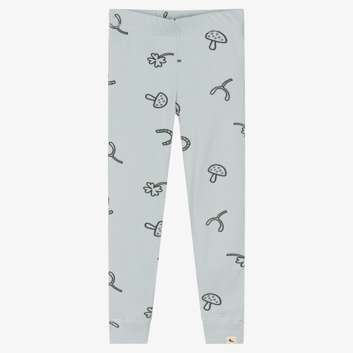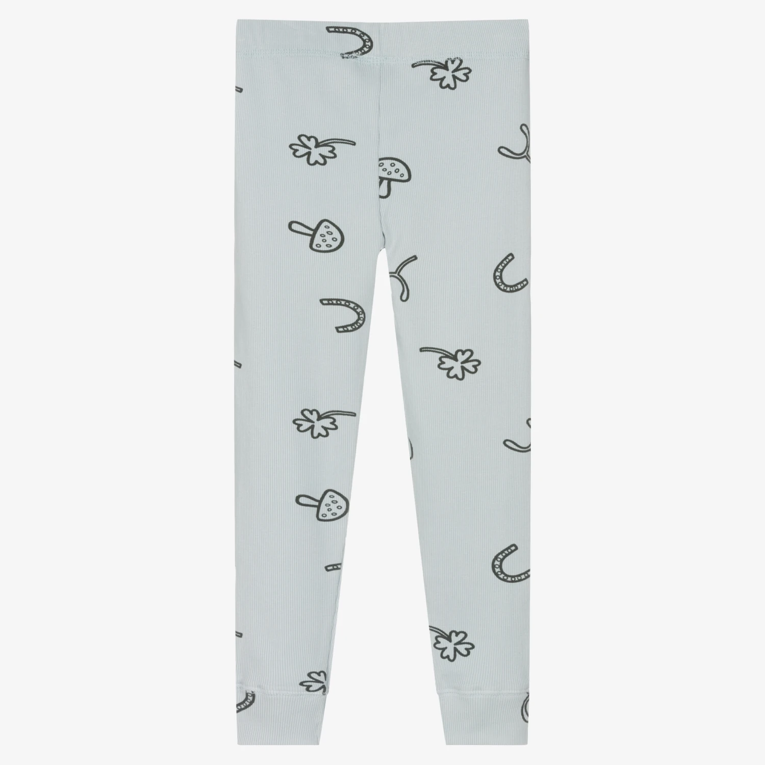 Pale blue organic cotton leggings for boys and girls by Turtledove London. Made in a soft and stretchy ribbed cotton jersey, these fun trousers feature a playful lucky charm design. The gently elasticated waist and leg cuffs allow for optimal comfort, and there is a small branded tab on the leg for a subtle designer finish.