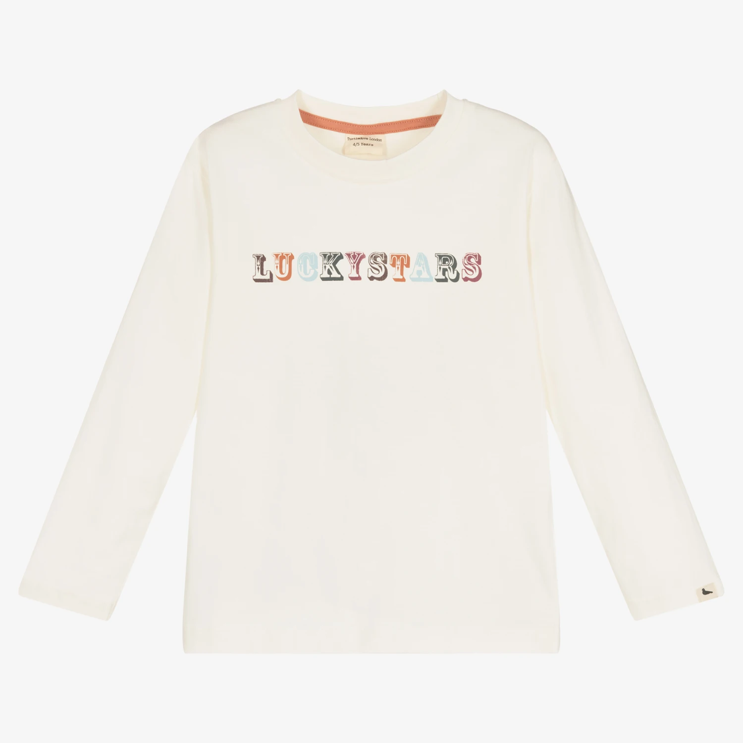Ivory organic cotton top by Turtledove London, suitable for boys and girls. Printed with a colourful Lucky Stars logo this casual top is made in soft, lightweight cotton jersey. There is a small logo tab on the cuff for an extra branded finish
