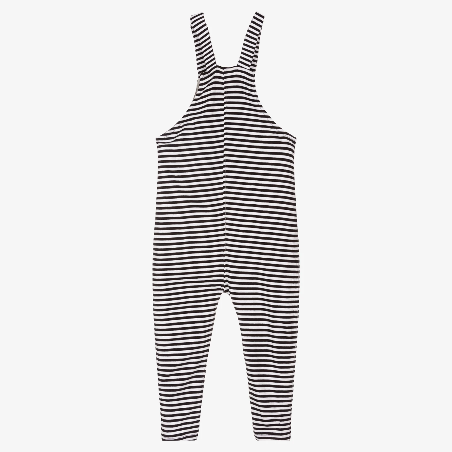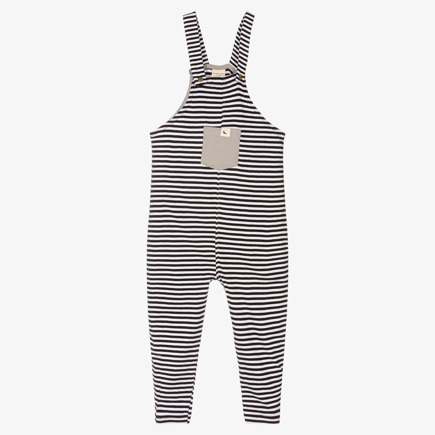 Black and ivory striped dungarees for girls and boys from Turtledove London. Made in soft organic cotton jersey, they have a grey chest pocket with the brand’s logo label, and popper fastening shoulder straps.