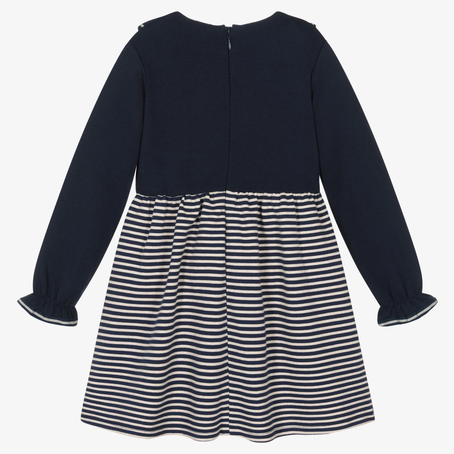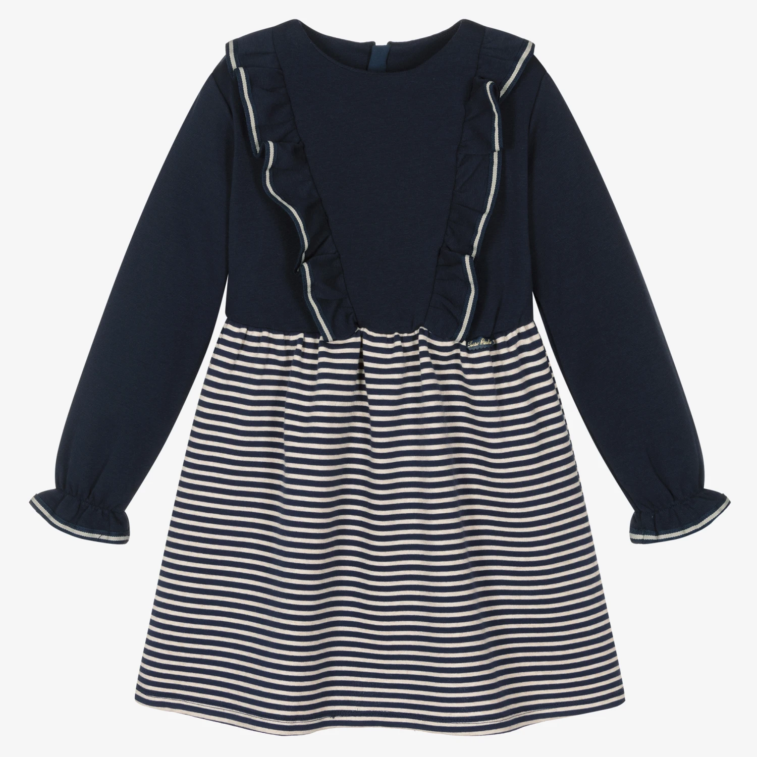 Pretty navy blue and ivory cotton blend dress for girls by Spanish brand Tutto Piccolo, made in stretchy jersey for all-day comfort. The bodice has frills on the front, with striped grosgrain trims, matching the gently elasticated and frilled cuffs. The striped skirt is gathered and full, with a logo tab on the waist. The dress fastens with a concealed zip on the back. Navy blue, cotton-blend tights with a contrasting blue logo on the sole of the foot complete the set.