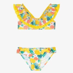 Cute yellow bikini for girls by Tutto Piccolo, made in soft, stretchy nylon and fully lined. With a vibrant green, yellow and orange exotic fruit print, the top has gorgeous ruffle trims on the neck and backline. The matching bottoms also have ruffle trims and decorative bows on the front.