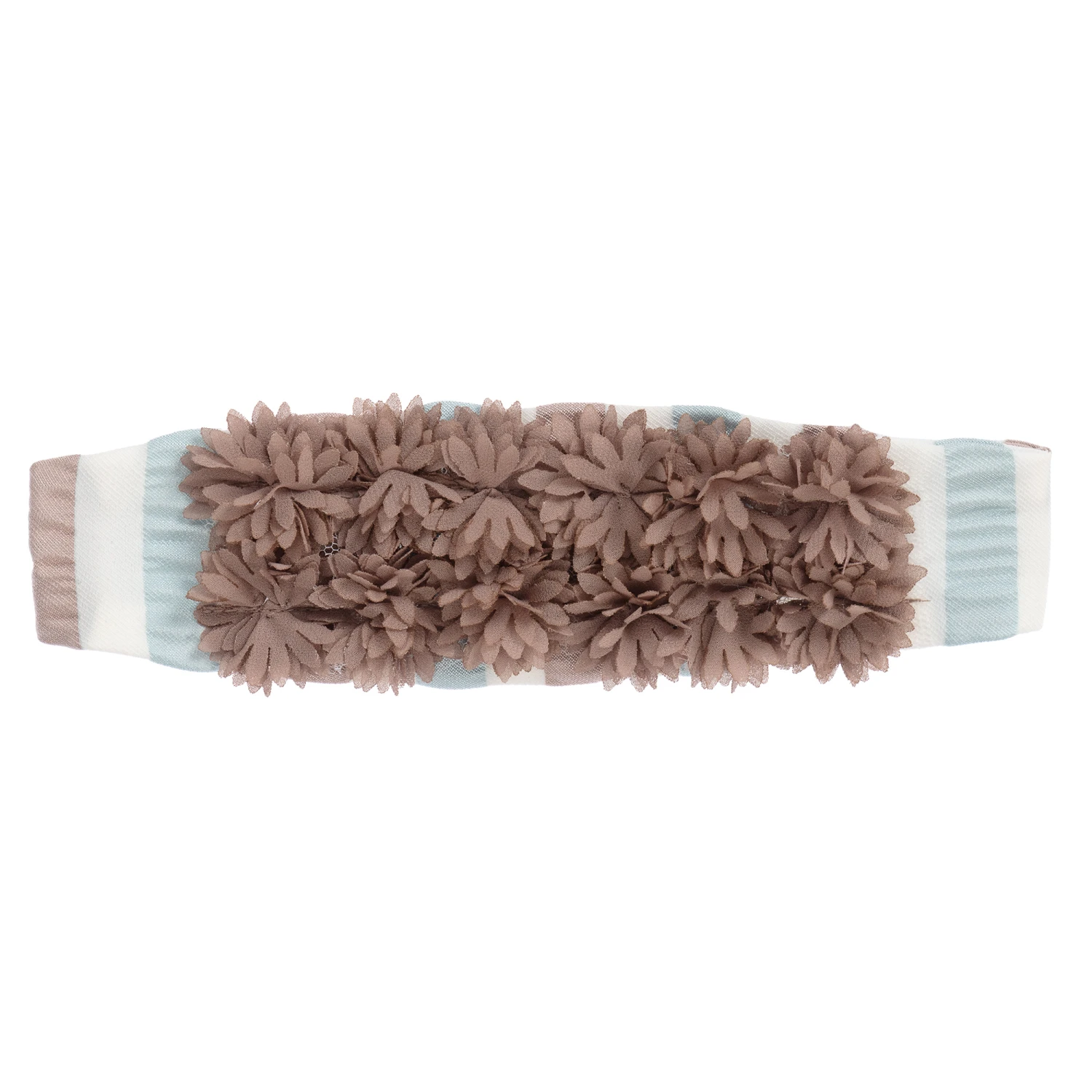 A lovely headband for girls in ivory, beige and mint green stripes by Tutto Piccolo. Made in silky polyester seersucker, the band is decorated with beige fabric flowers and is elasticated for a comfortable fit.