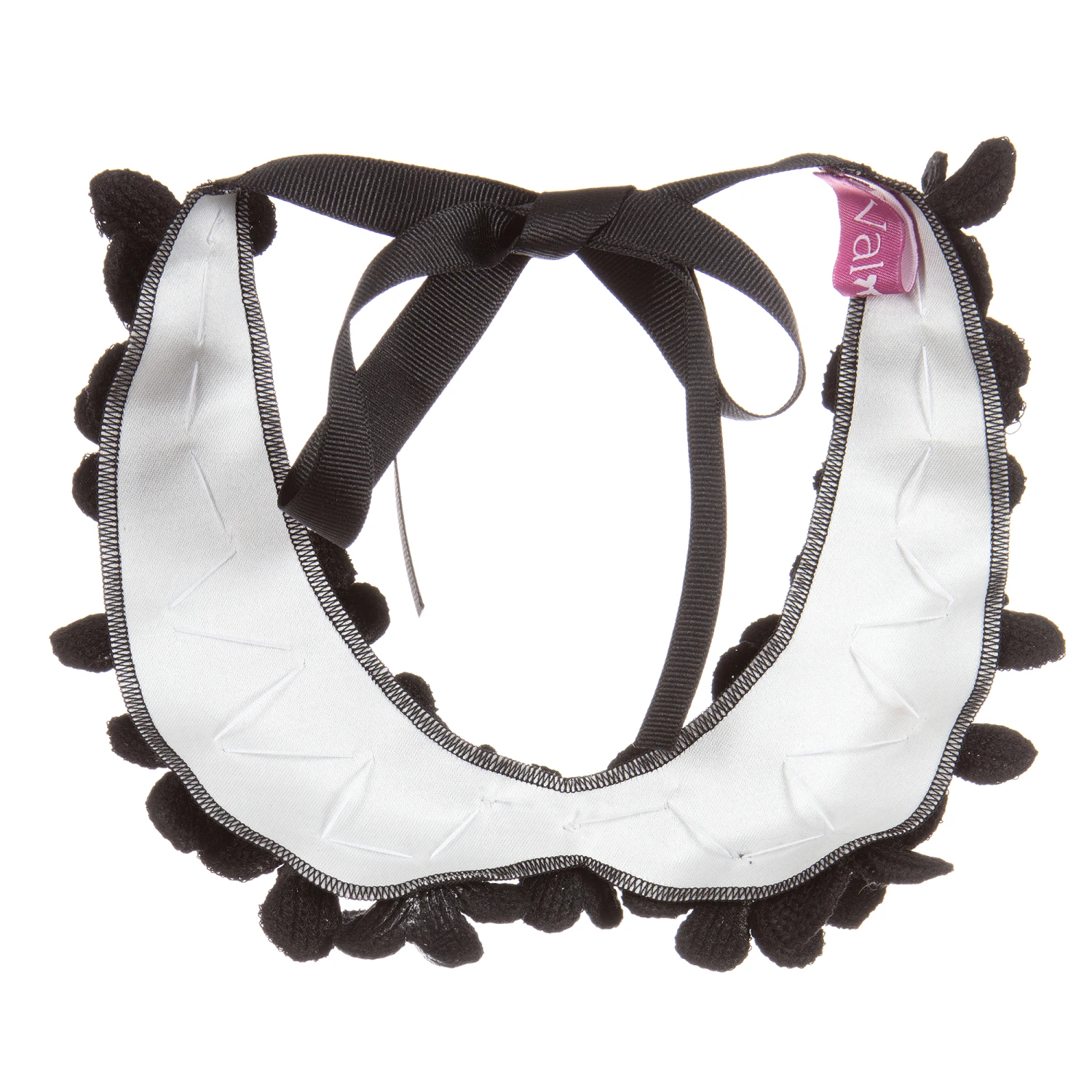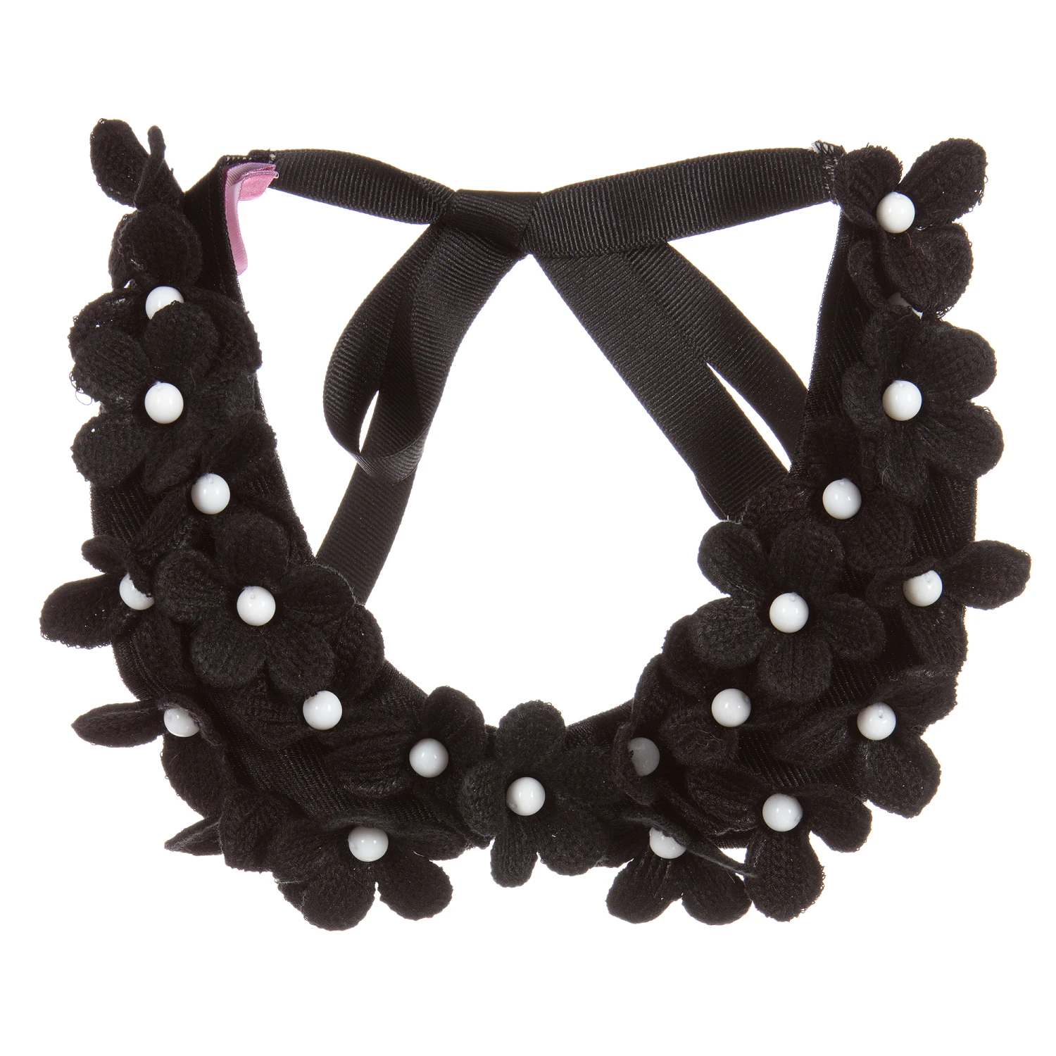 A super chic decorative collar by ValMax decorated with black appliqué flowers and white beads. The collar ties with a grosgrain ribbon on the nape of the neck.