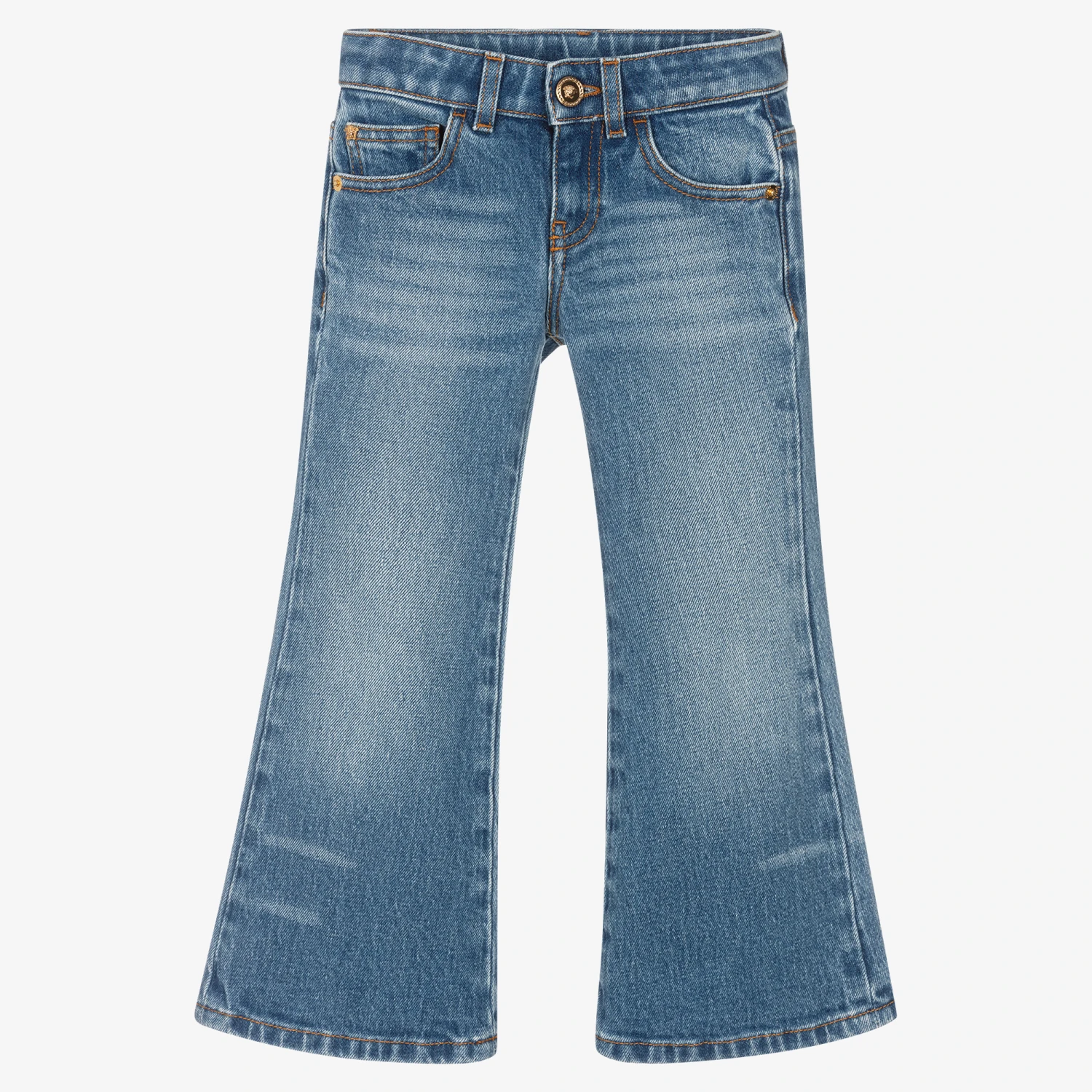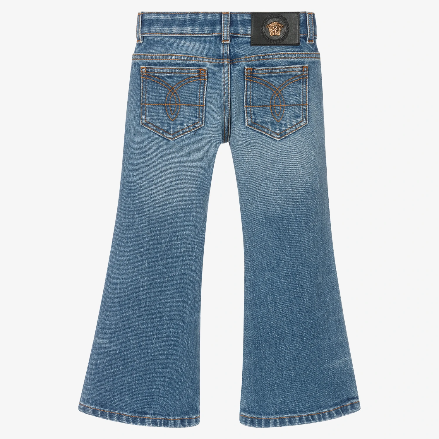 Stylish blue-washed jeans for girls by Italian brand Versace, with flared, boot-cut fit. This luxury design is accentuated with the golden Medusa icons, golden rivets and a black logo patch on the back for a complete Versace look throughout. They are made in soft cotton denim with classic five-pocket styling.