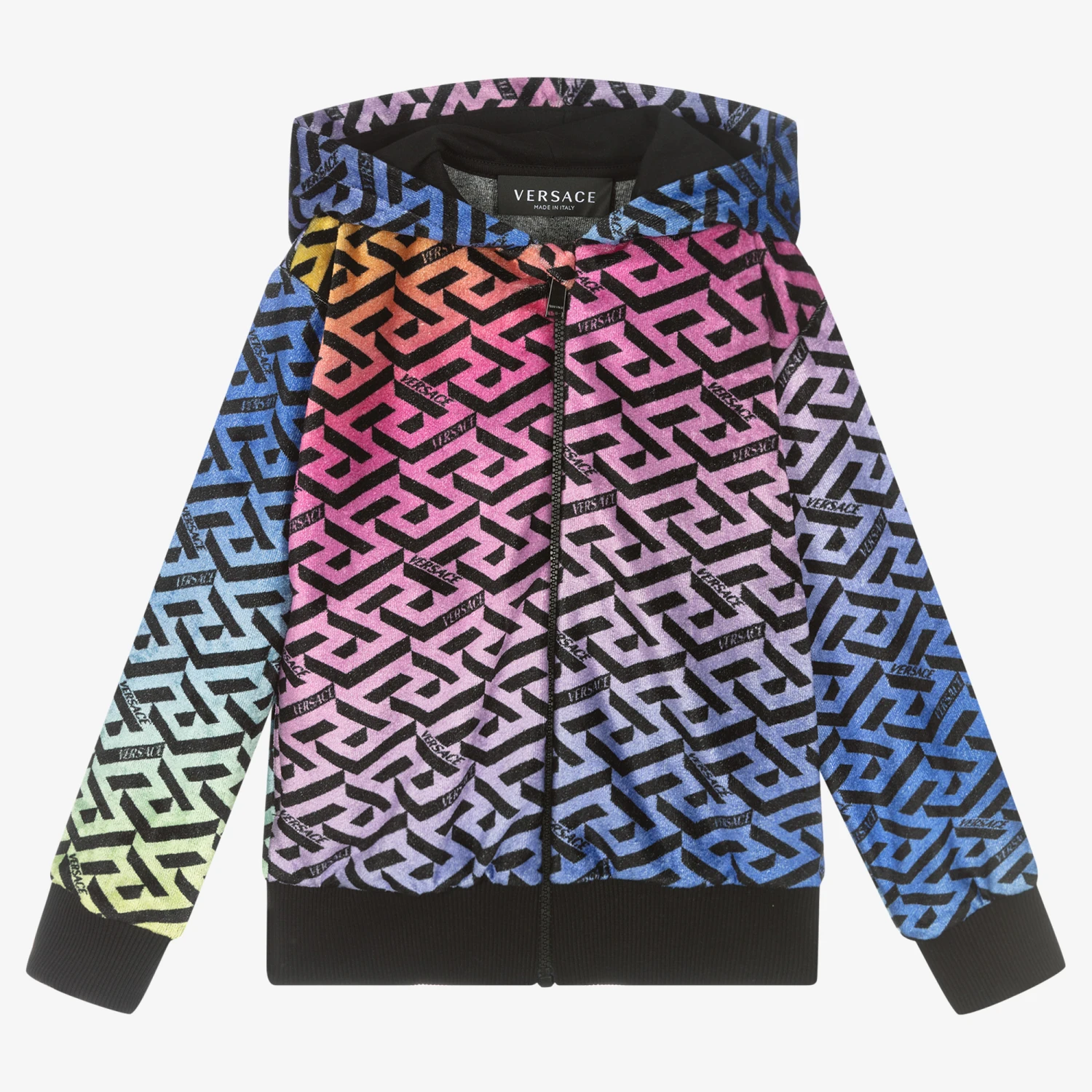 Multicoloured hooded zip-up top for girls by Italian luxury fashion brand Versace, made in a super soft viscose blend. Guaranteed to stand out, it is patterned in a fun, all-over La Greca print. Lined in soft cotton jersey, it has a front zip fastening with a protective chin guard, and ribbed cuffs for added comfort.