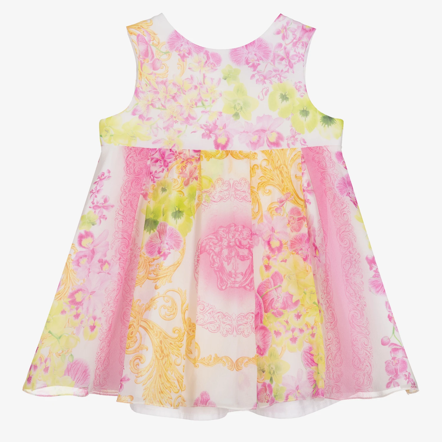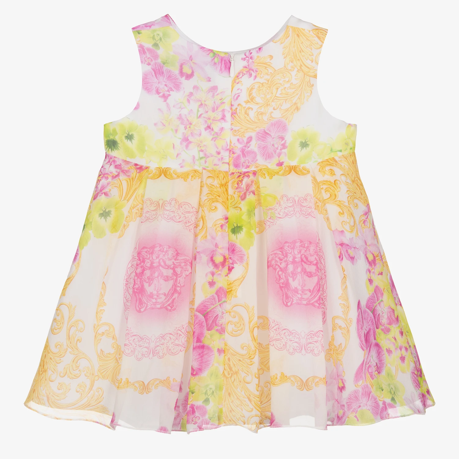 Gorgeous white, sleeveless dress for little girls by luxury Italian brand Versace, made in beautiful lightweight silk. It has a pretty pink and green floral pattern, with gold Barocco detailing and a pink Medusa logo print on the front. This lovely dress is lined in lightweight voile and has a concealed zip fastening on the back.