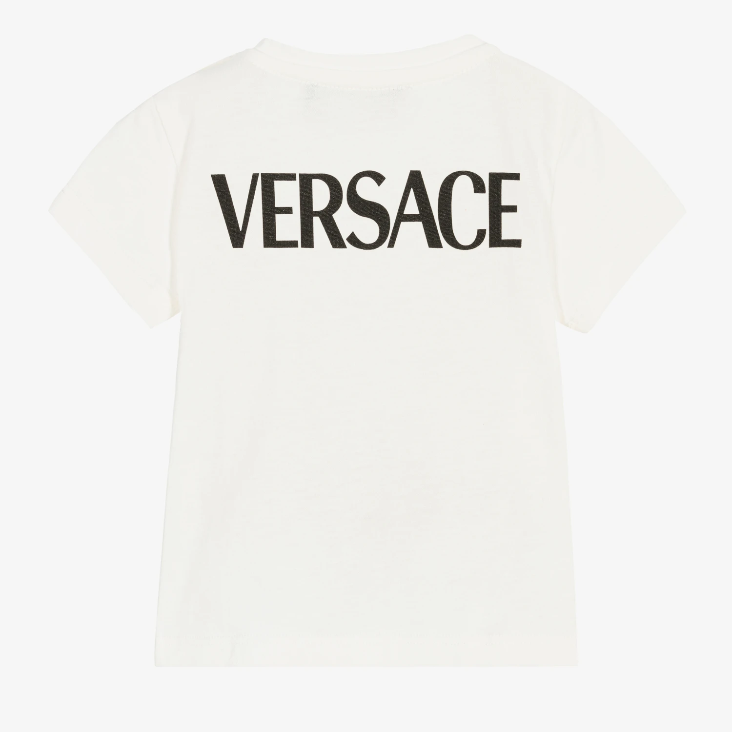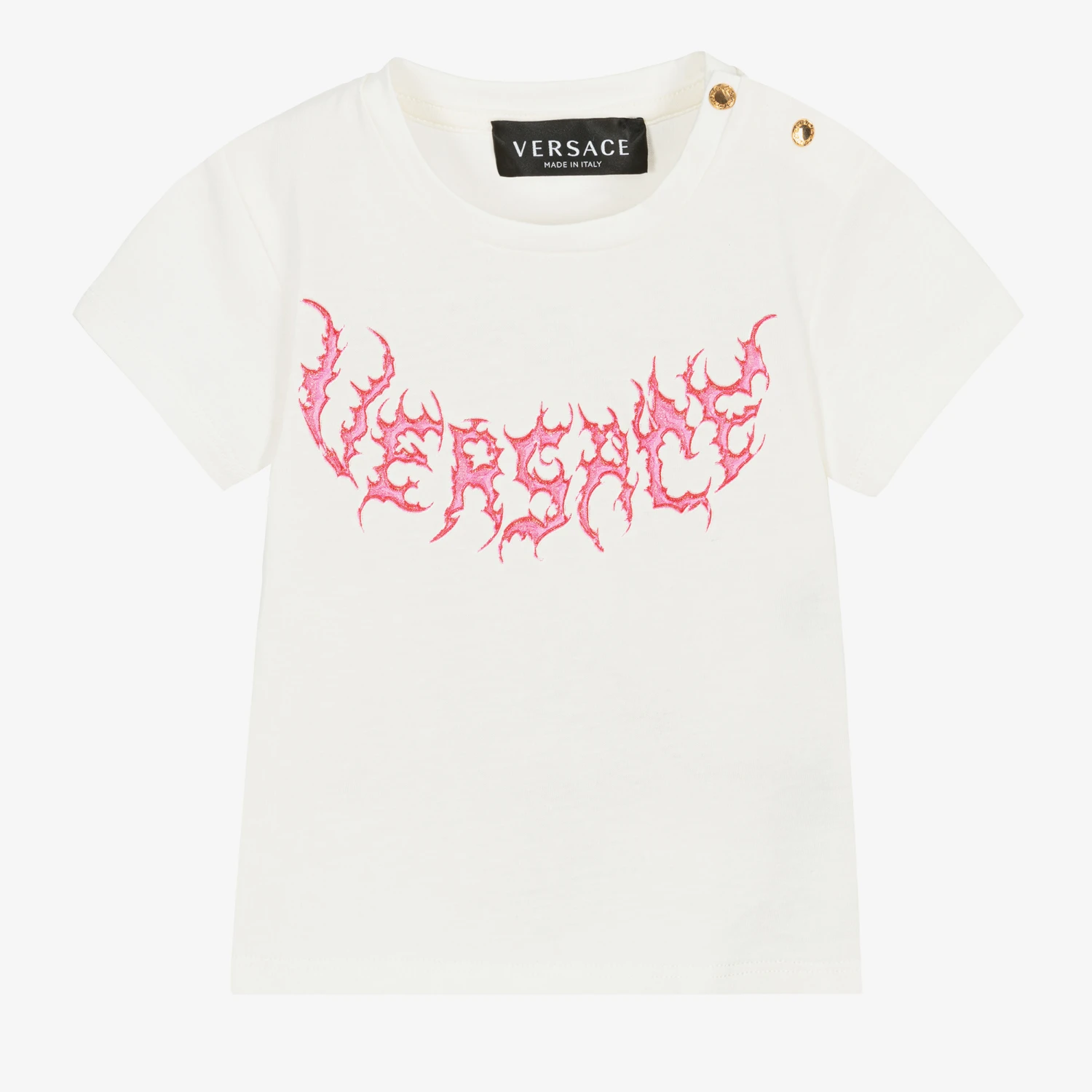 Off-white T-shirt for little girls by luxury fashion house Versace, made in soft cotton jersey. It has a flaming logo in sparkly red and pink on the front, with a solid black logo on the back. For an extra designer touch, the gold shoulder poppers are embossed with the signature Greca pattern.