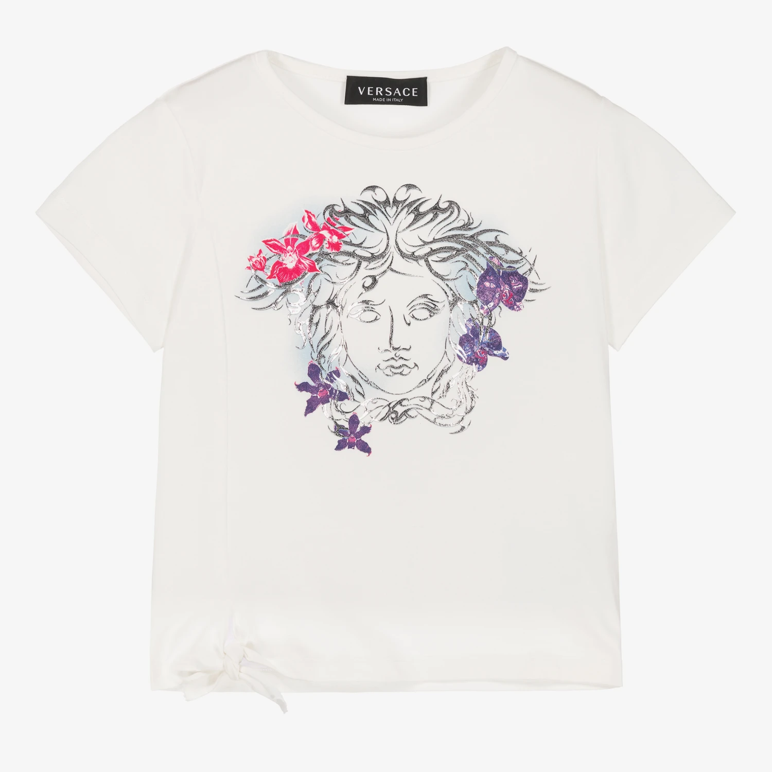 Off-white T-shirt for girls by luxury fashion house Versace, made in soft cotton jersey. The designer’s iconic Medusa logo is featured on the front in shiny silver, with beautiful pink and purple flowers. There is a playful knotted tie on one side for a touch of fun.