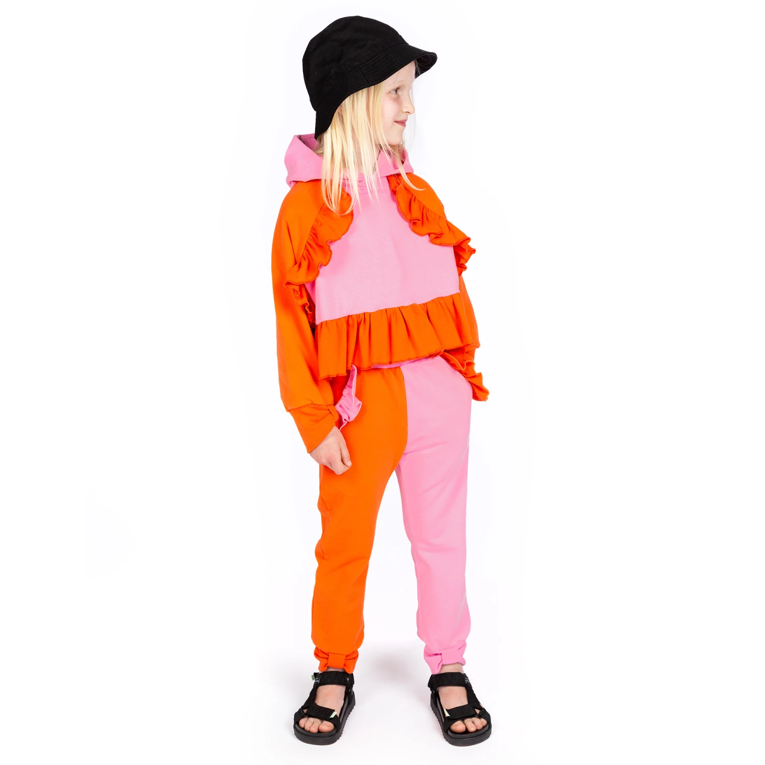 Little girls orange and pink colour block joggers from Wauw Capow by Bangbang. Made in soft and stretchy, mid-weight jersey with a fleecy interior, there are contrast colour frills on the front pockets, sweet bow details on the cuffs and a gently elasticated waist.