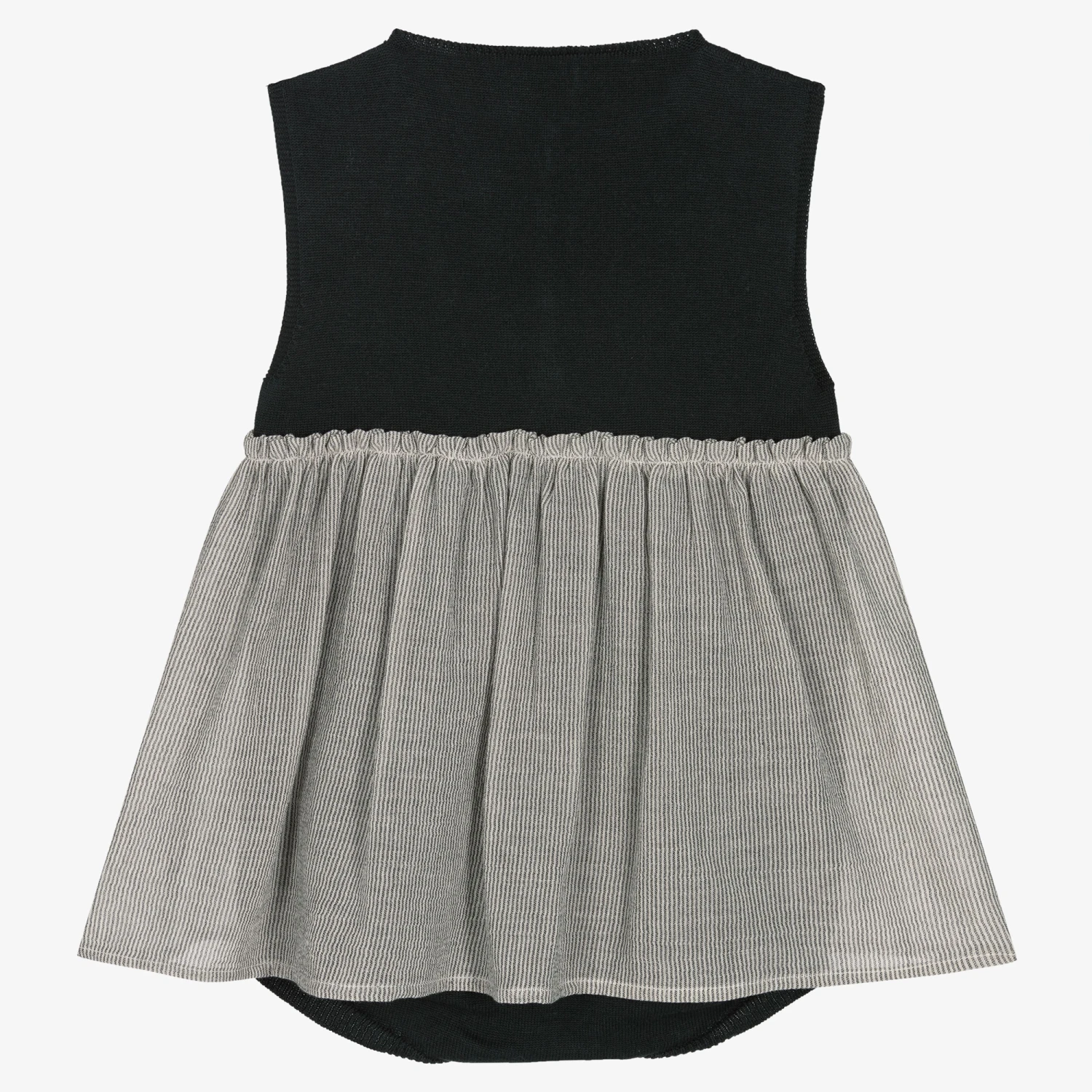 Lovely comfortable dark grey dress for little girls by Portuguese brand, Wedoble. Made with organic cotton it is designed as a soft knitted bodysuit with button fastenings between the legs, and has an attached lightweight striped skirt. A simple, sleeveless style, it has wooden button fastenings on the front to complete the look.