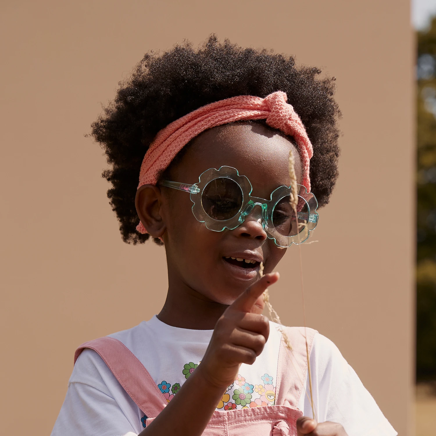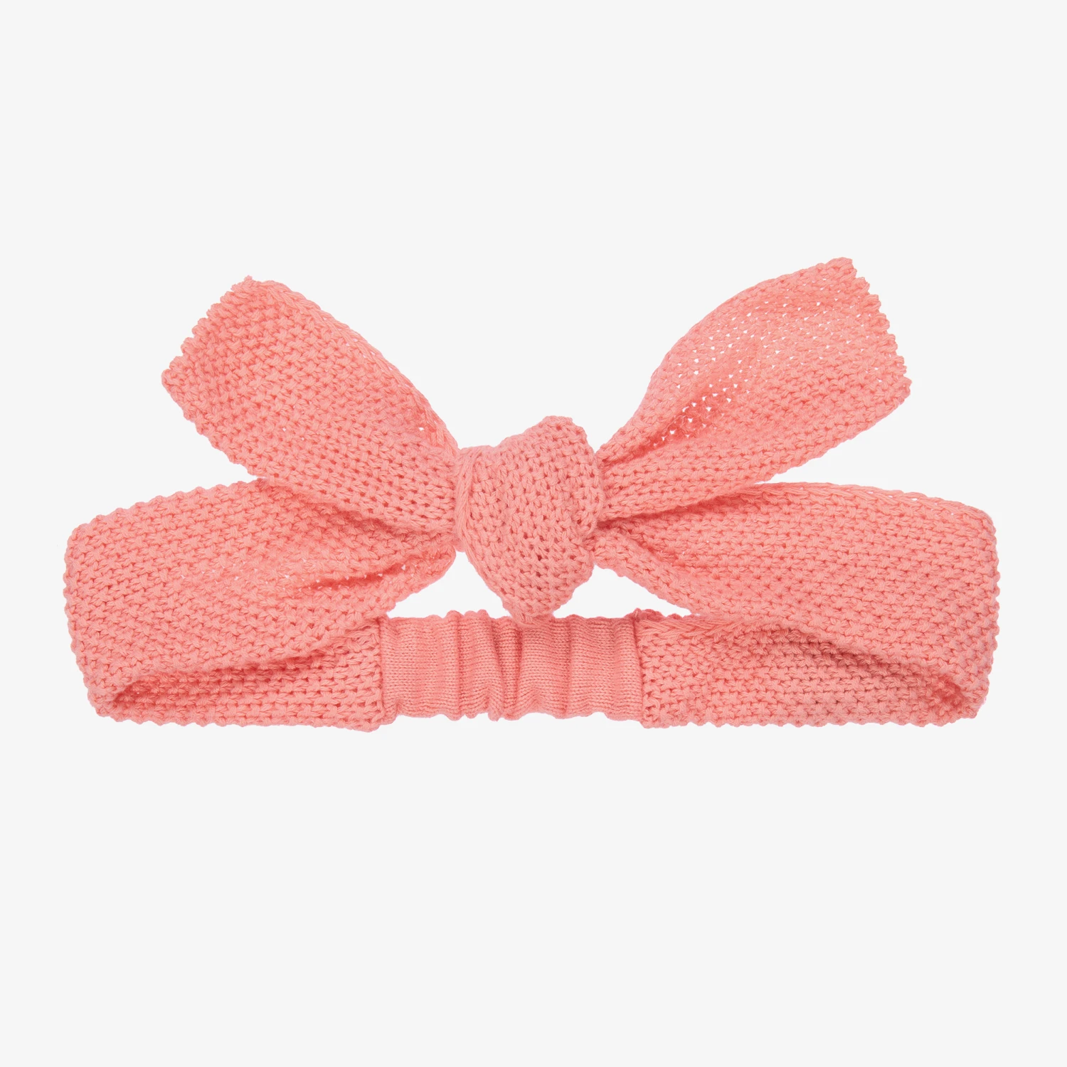 Pretty coral pink headband for baby girls by Wedoble. Knitted in soft cotton, it has a lovely moss stitch pattern. The back is elasticated and the front fastens in an adjustable knot.