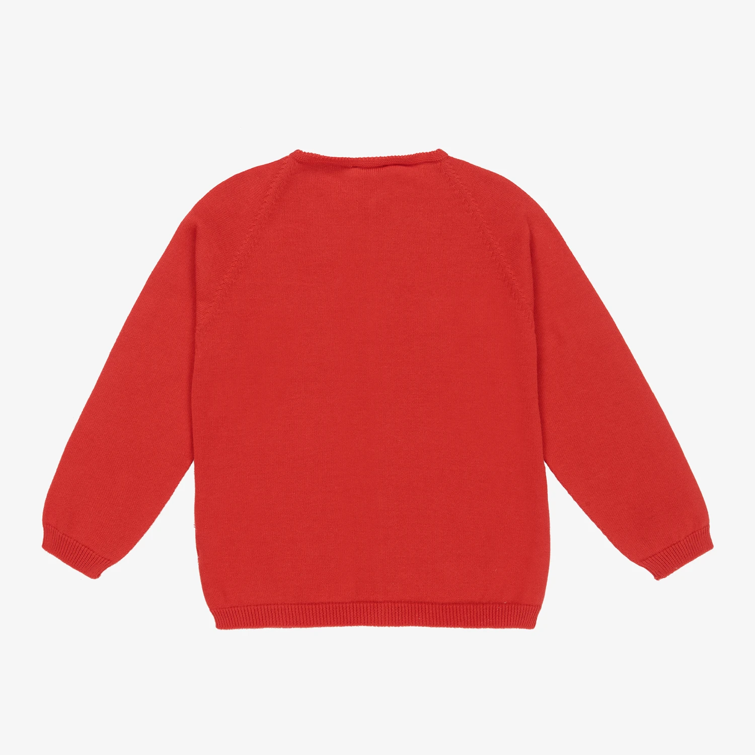 Lovely red cardigan for little girls and boys by Wedoble, finely knitted in soft organic cotton. It has branded pearly buttons and stylish cable trim along the button placket.