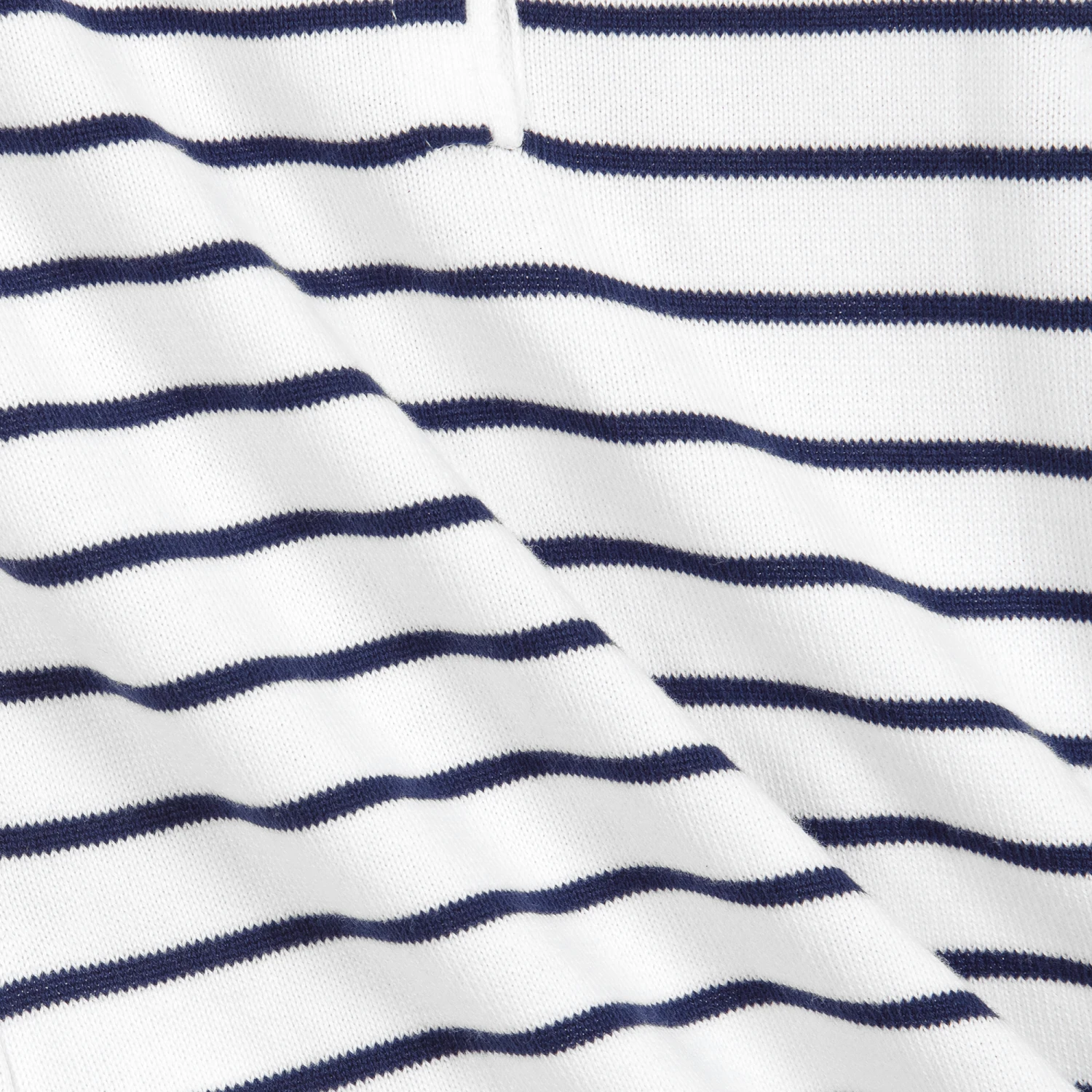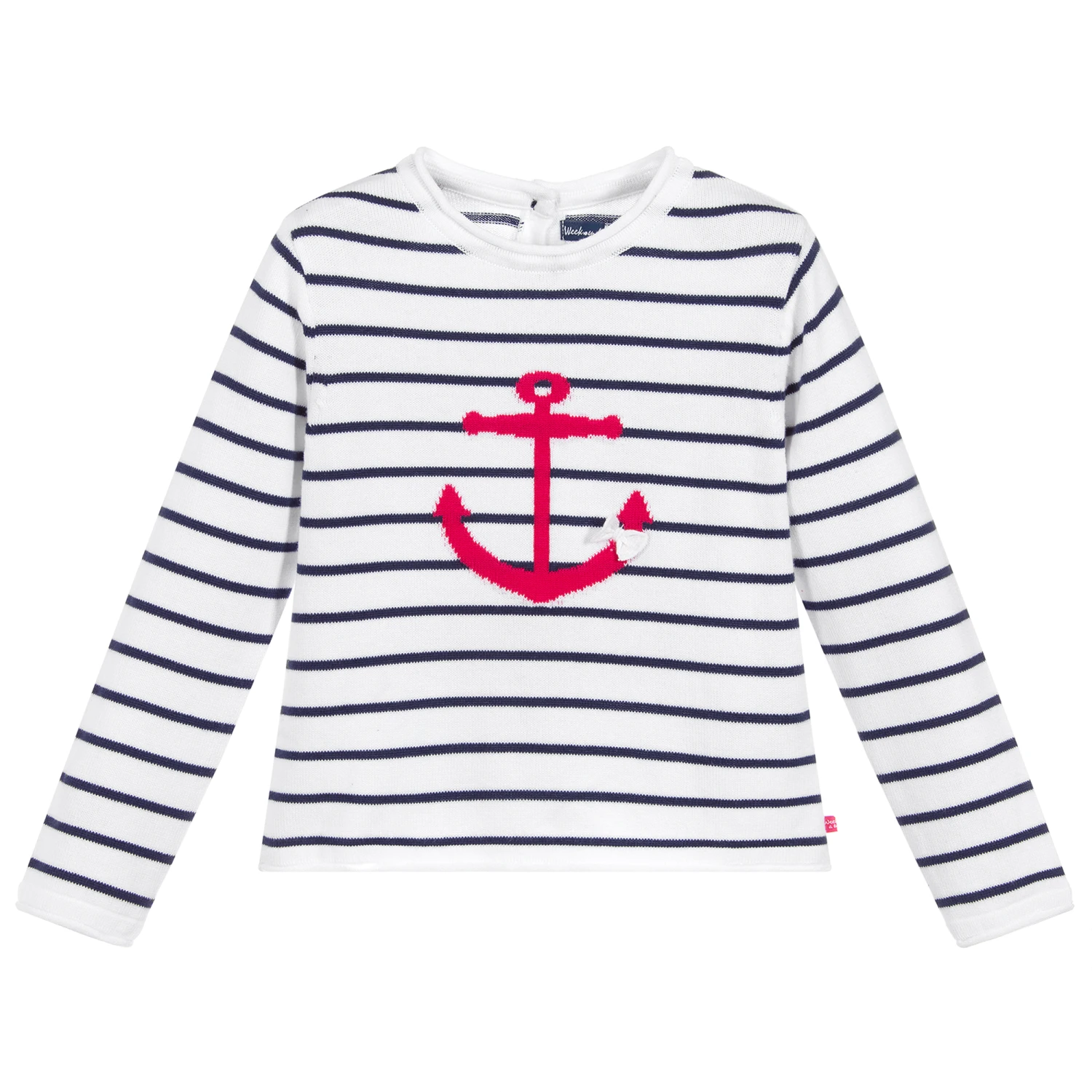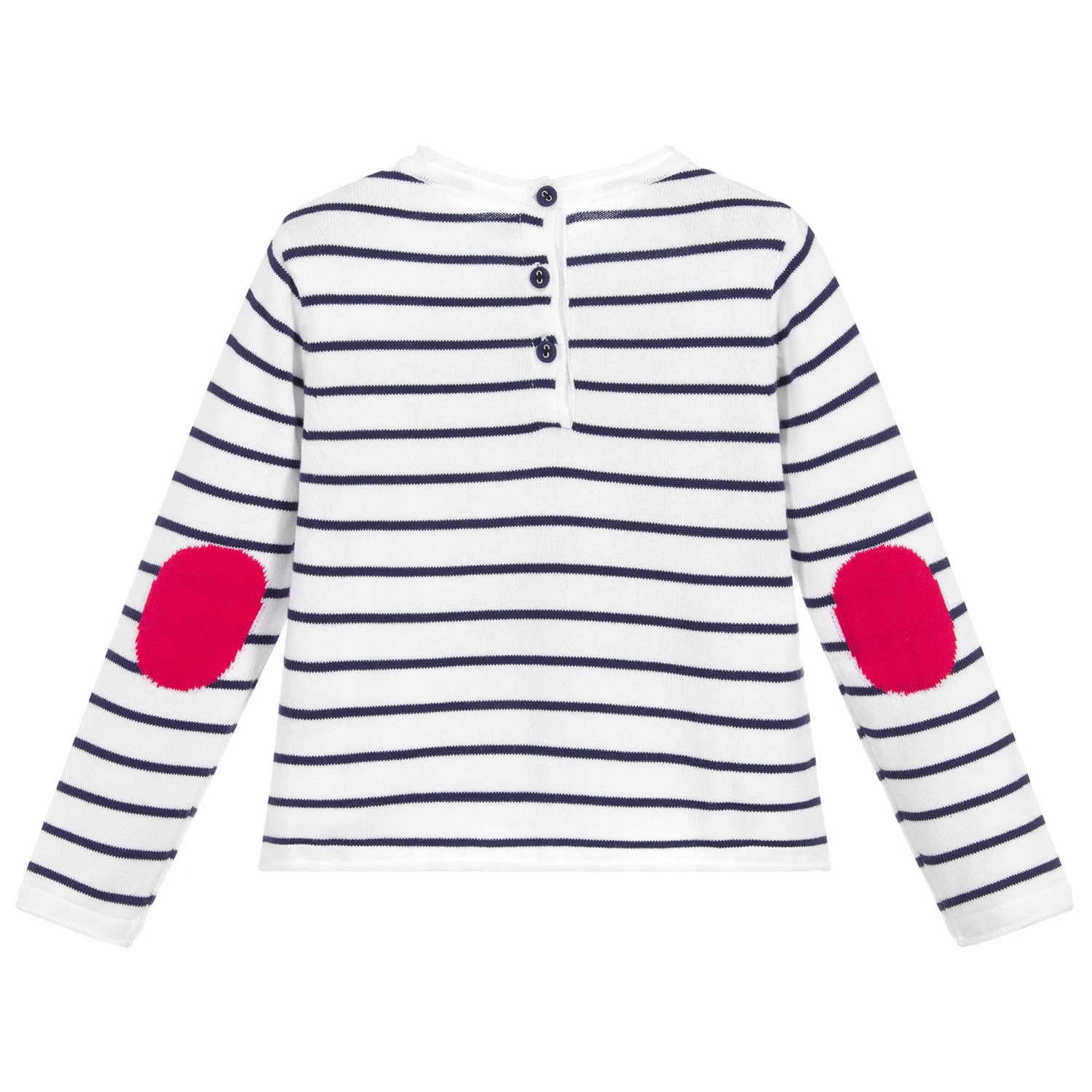 White and navy blue striped sweater for girls by Week-end à la mer. Knitted in soft cotton, with pink detailing.