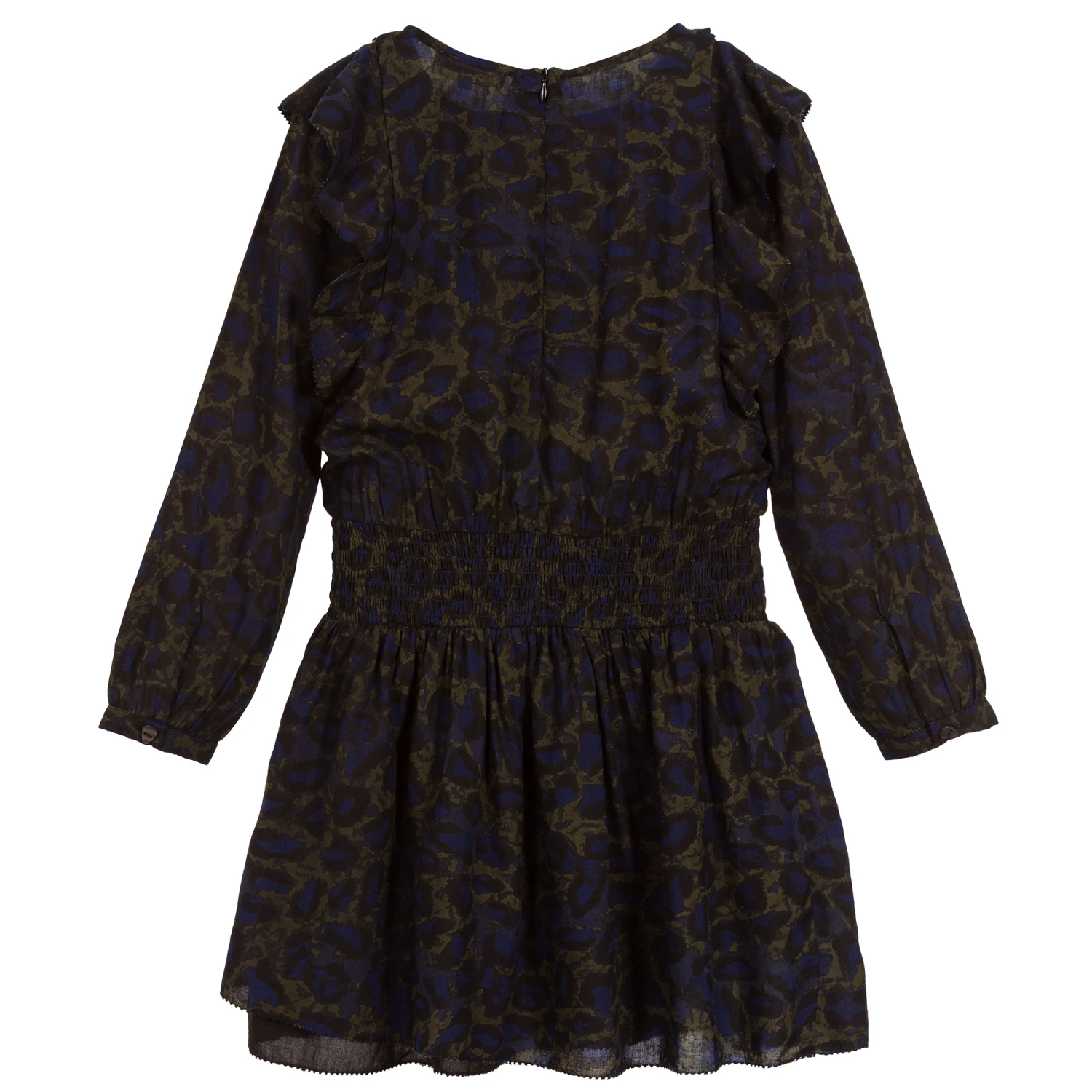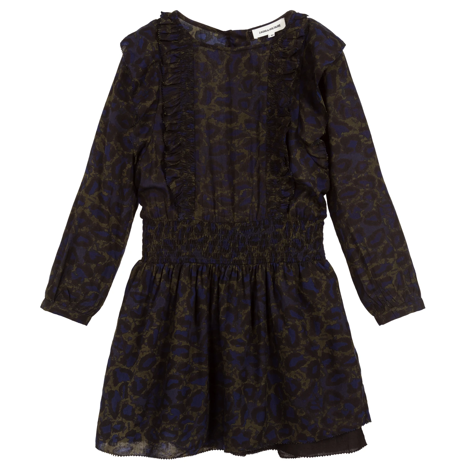 A gorgeous Mini-me dress by Zadig & Voltaire, made in lightweight and soft viscose. It has a black and blue leopard camo print on top of a dark green background, with an elasticated, ruched dropped waist. The embroidered edged ruffles add a feminine ‘rock chic’ look. The hem has an uneven finish.