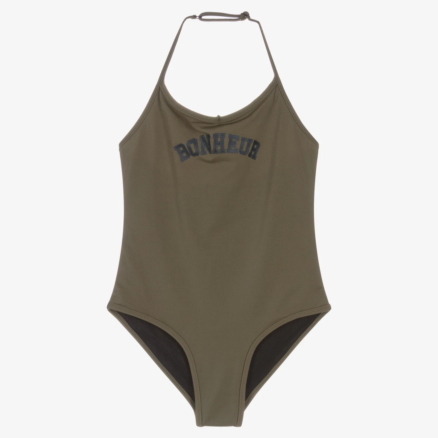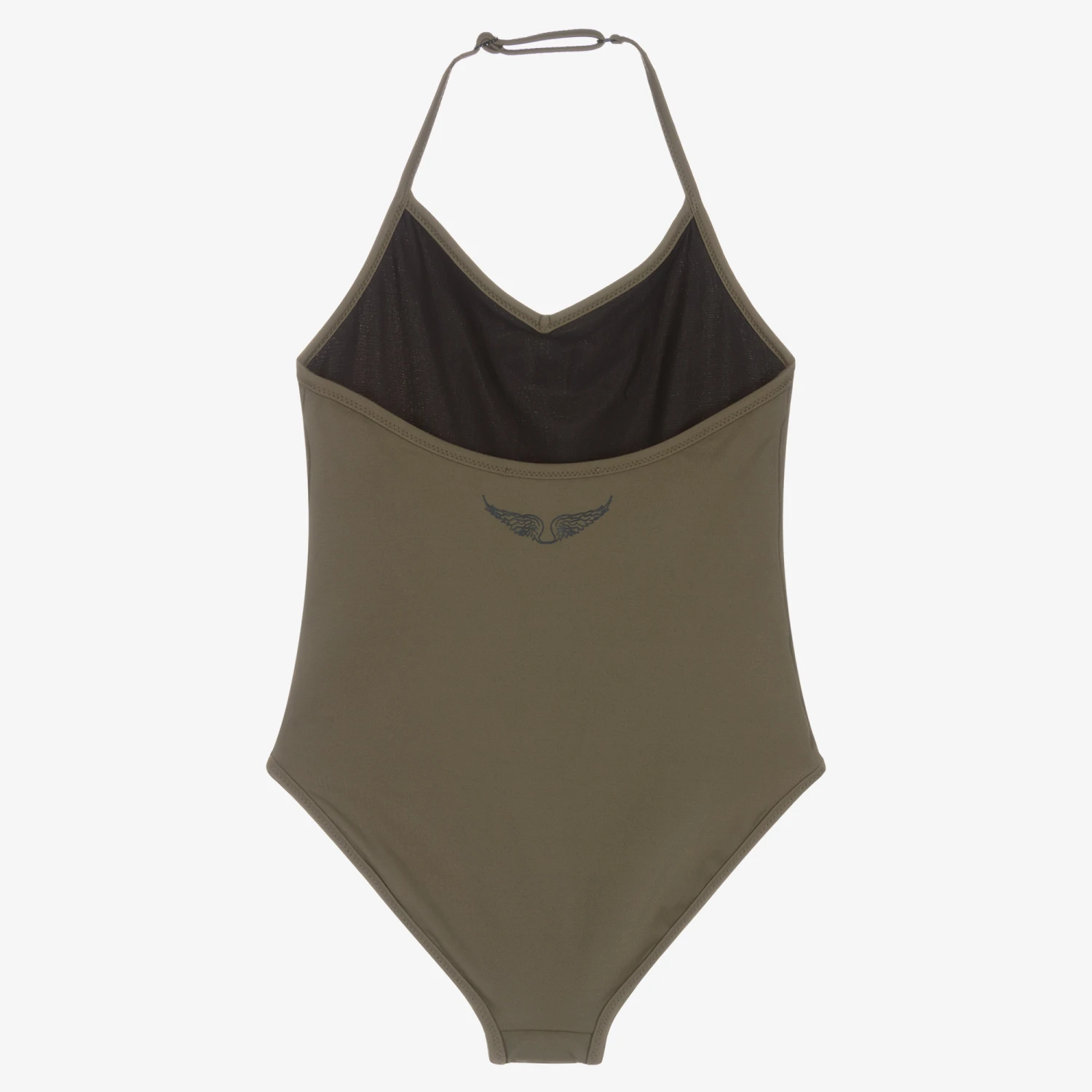 Khaki green swimsuit for girls by Zadig&Voltaire. Silky smooth and stretchy, this elegant swimsuit has an adjustable halterneck for a timeless silhouette. The front is printed with the French word for happiness and a small angel wings print on the back gives a sweet finish.